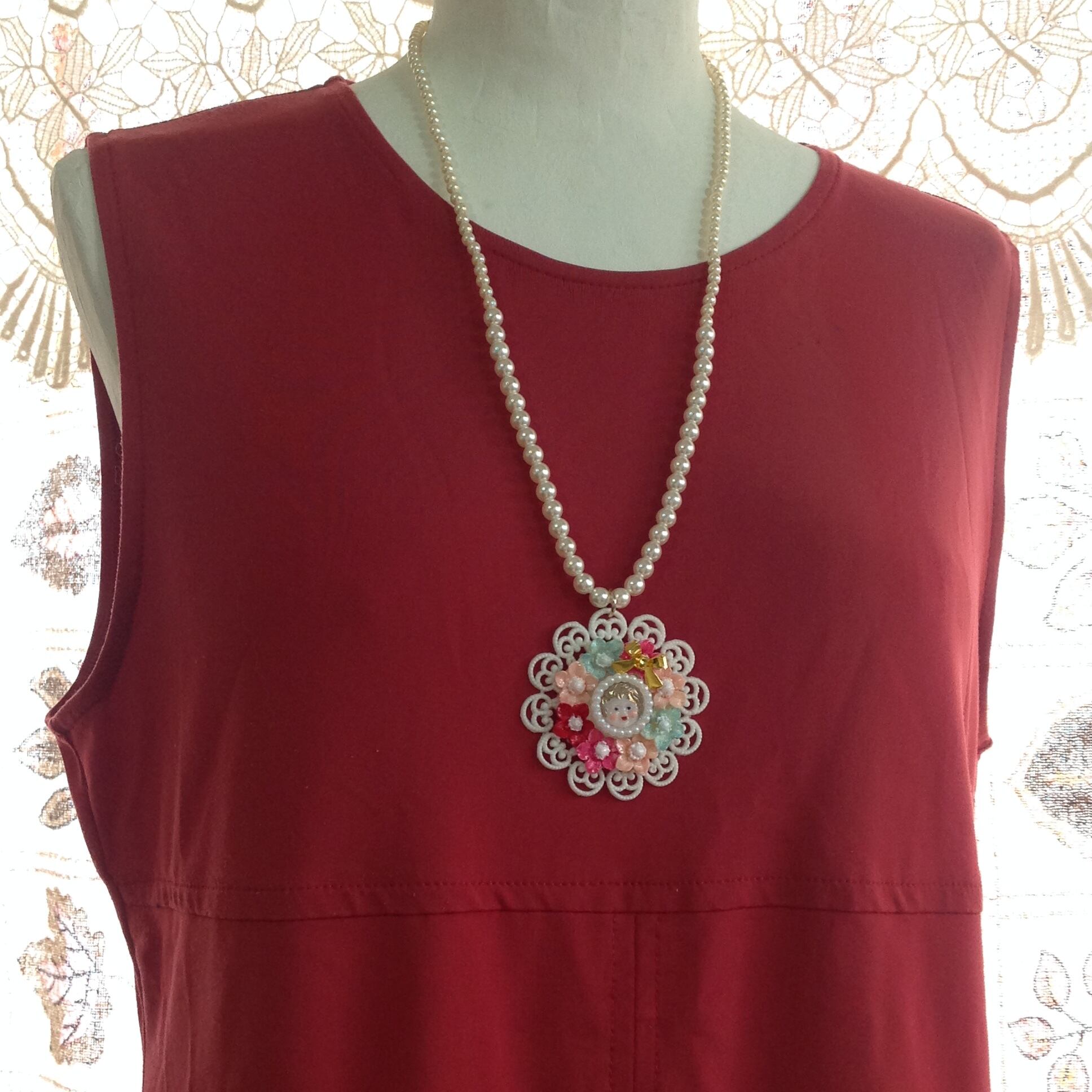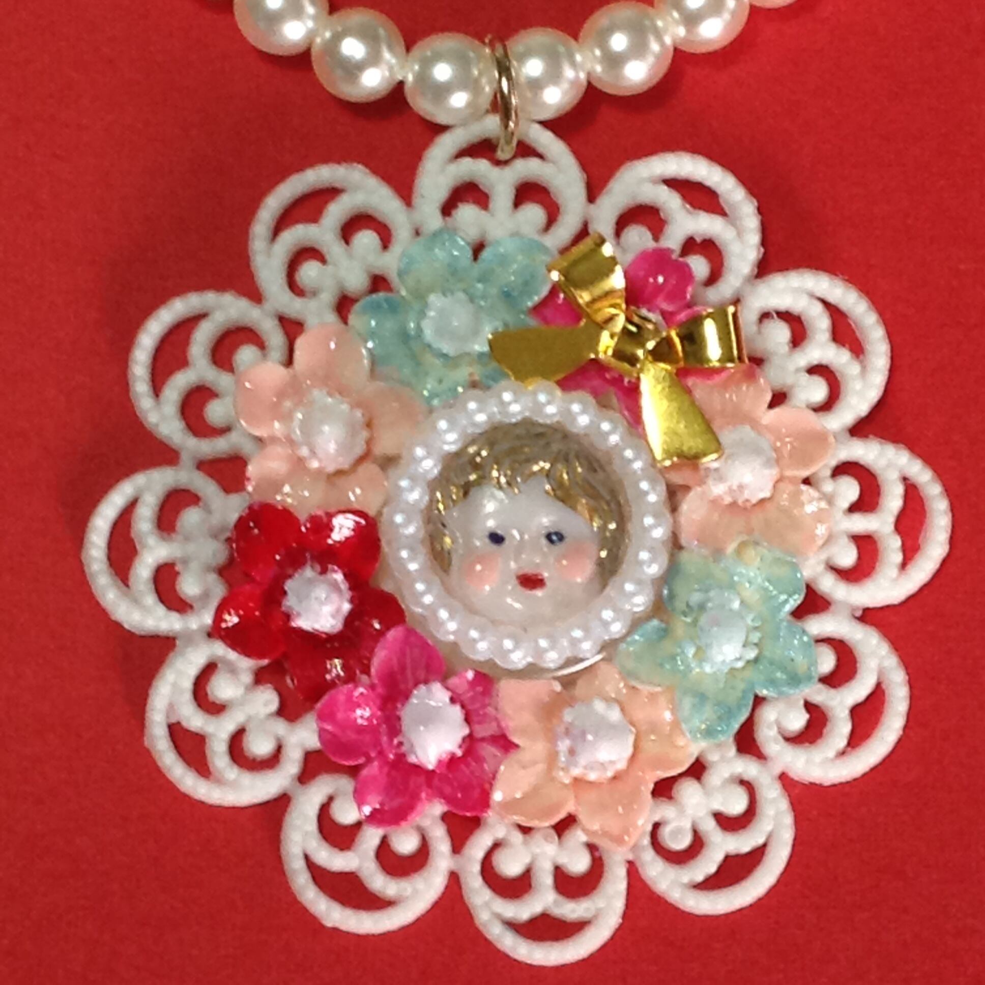 ペンダントトップは繊細で綺麗なレリーフのパーツです。リボンを付けてニコニコした女の子。