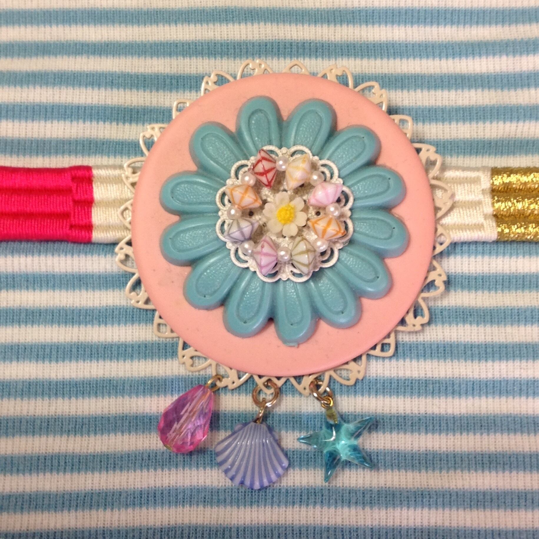 ピンクとブルーを基調に、お菓子みたいなKitschなお色のパーツを組み合わせました。