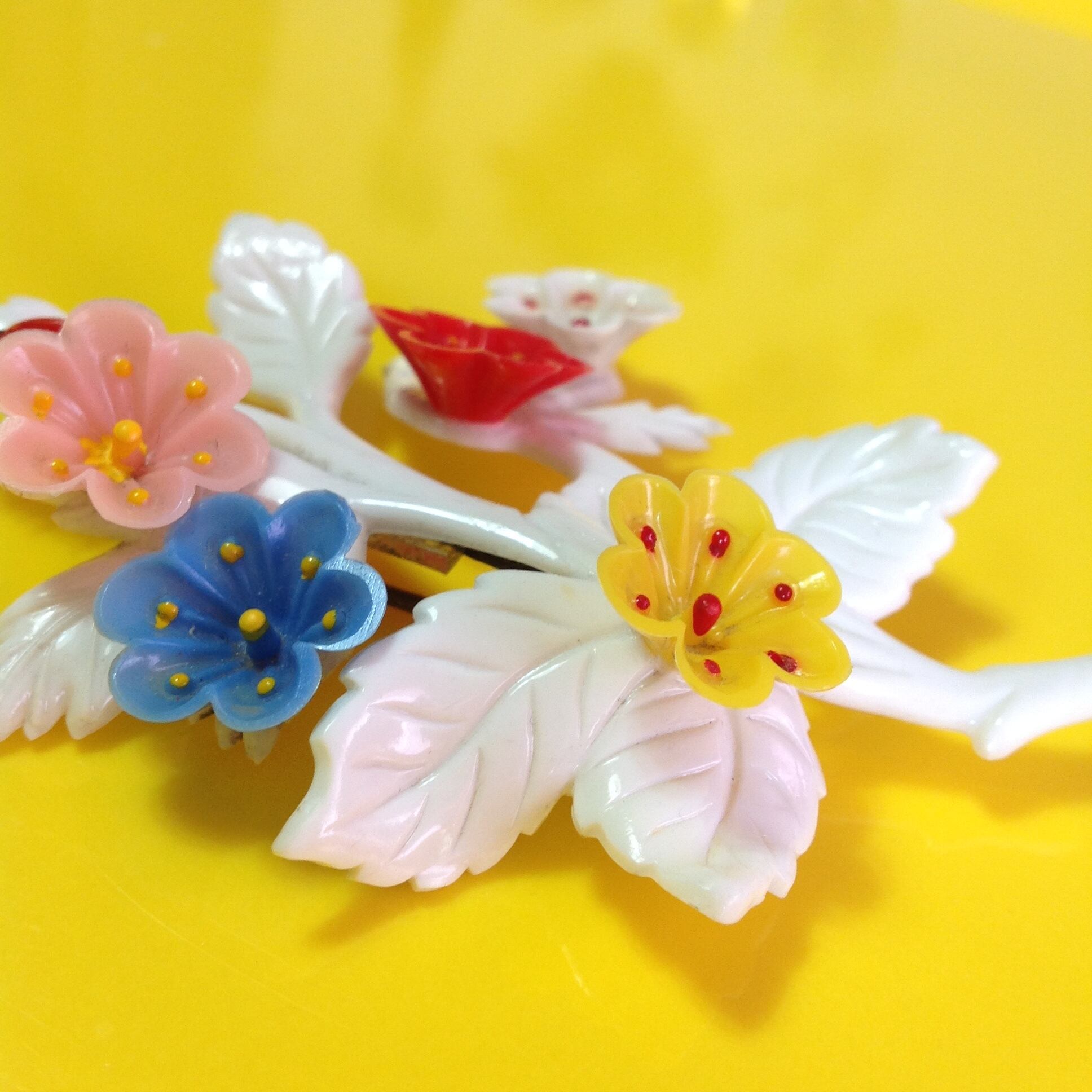 m017 水玉のお花と葉っぱのブローチ(帯飾り)