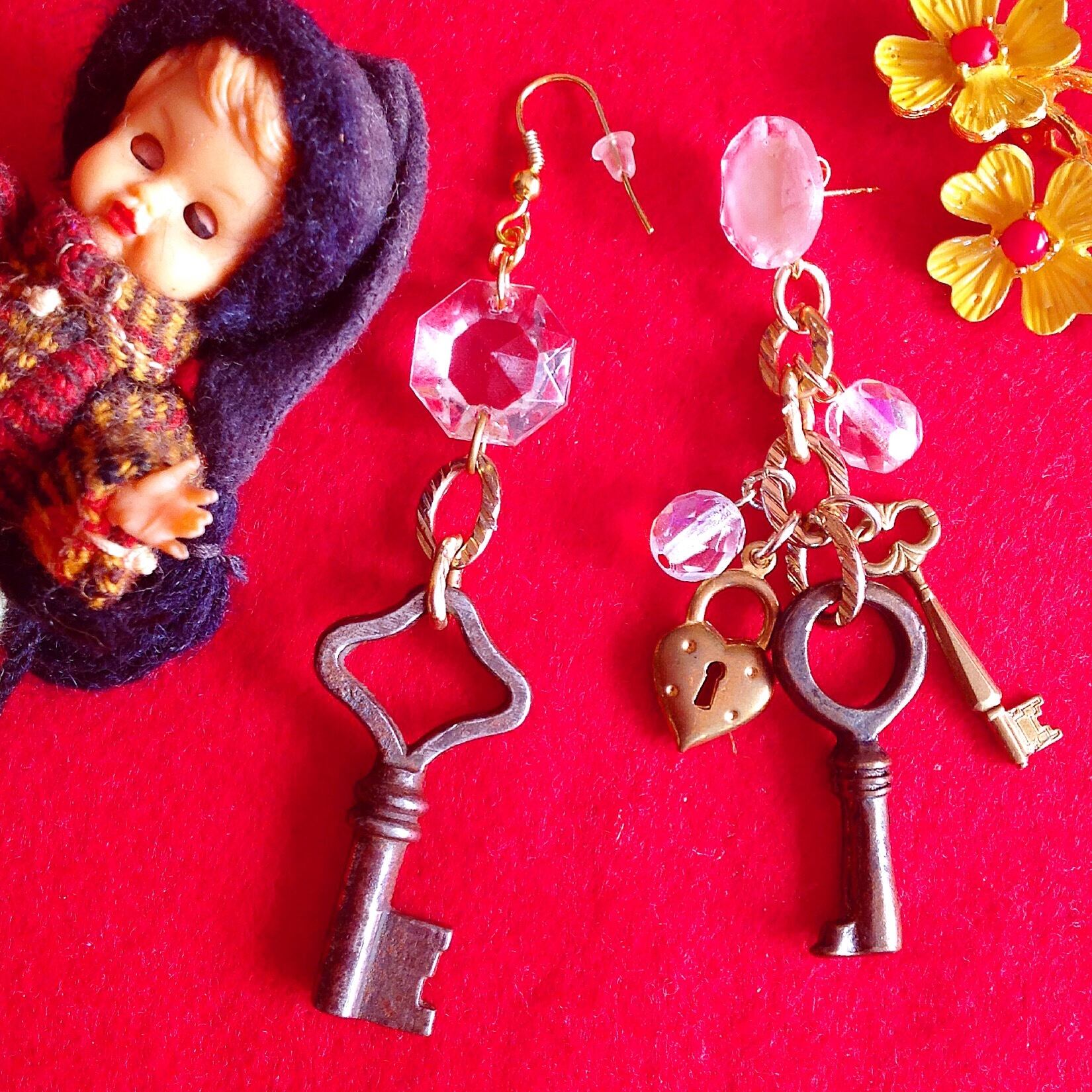 【素材】フランスアンティークガラスシャンデリアパーツ/フランスvintageメタル鍵パーツ/