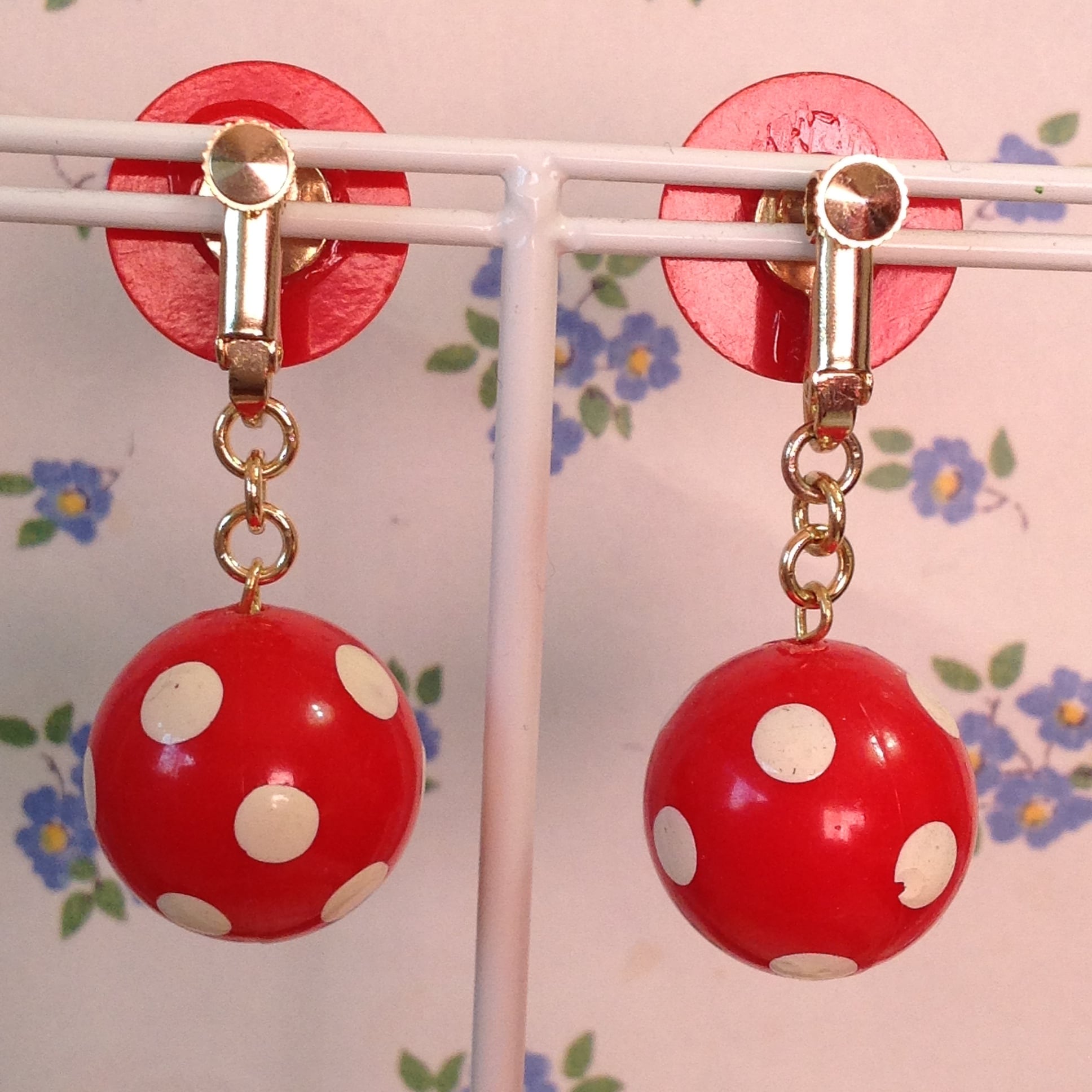 s363 ビンテージビーズの真っ赤なイヤリング(水玉ペイント入り)