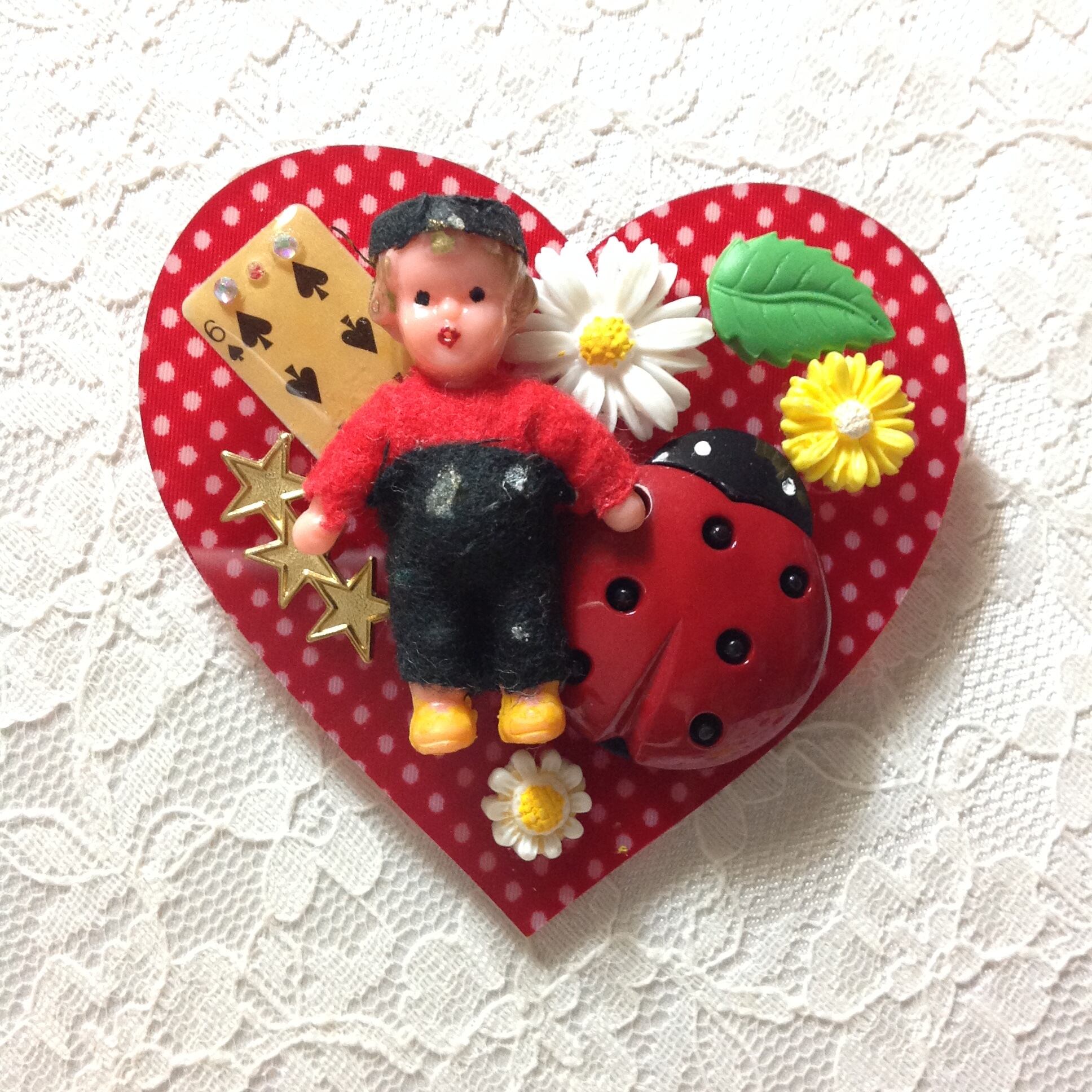 テントウムシ、トランプ、マーガレット、三連の星をコラージュしました。