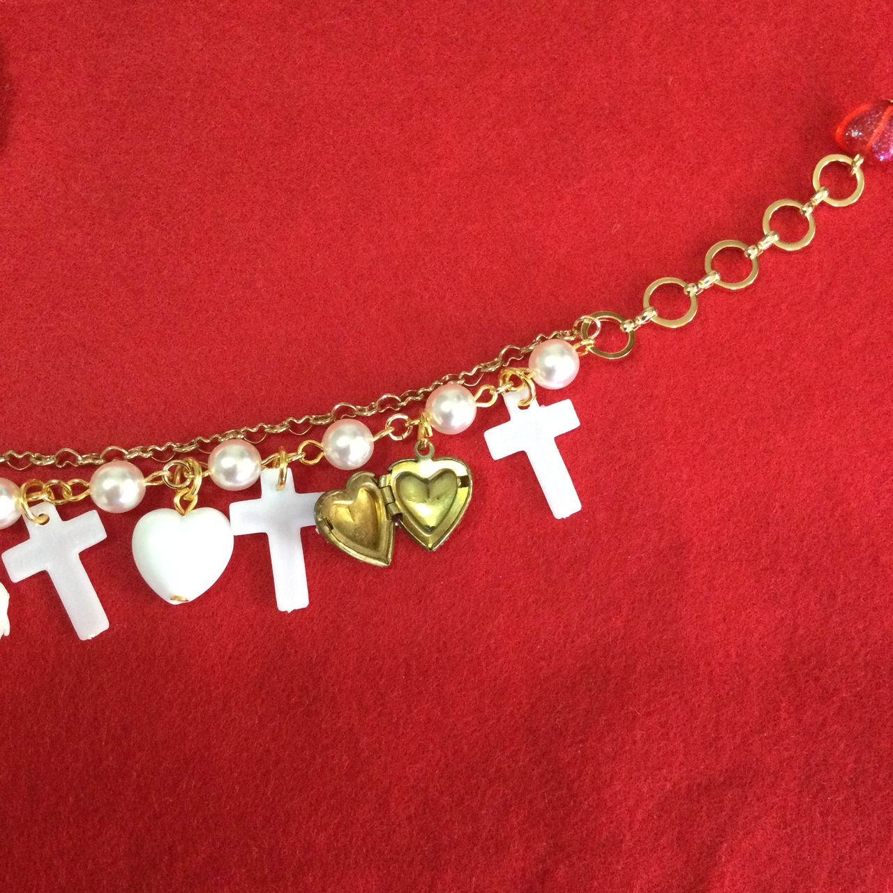ハート、十字架、星、薔薇のお花、赤いハートが付いたブレスレット。