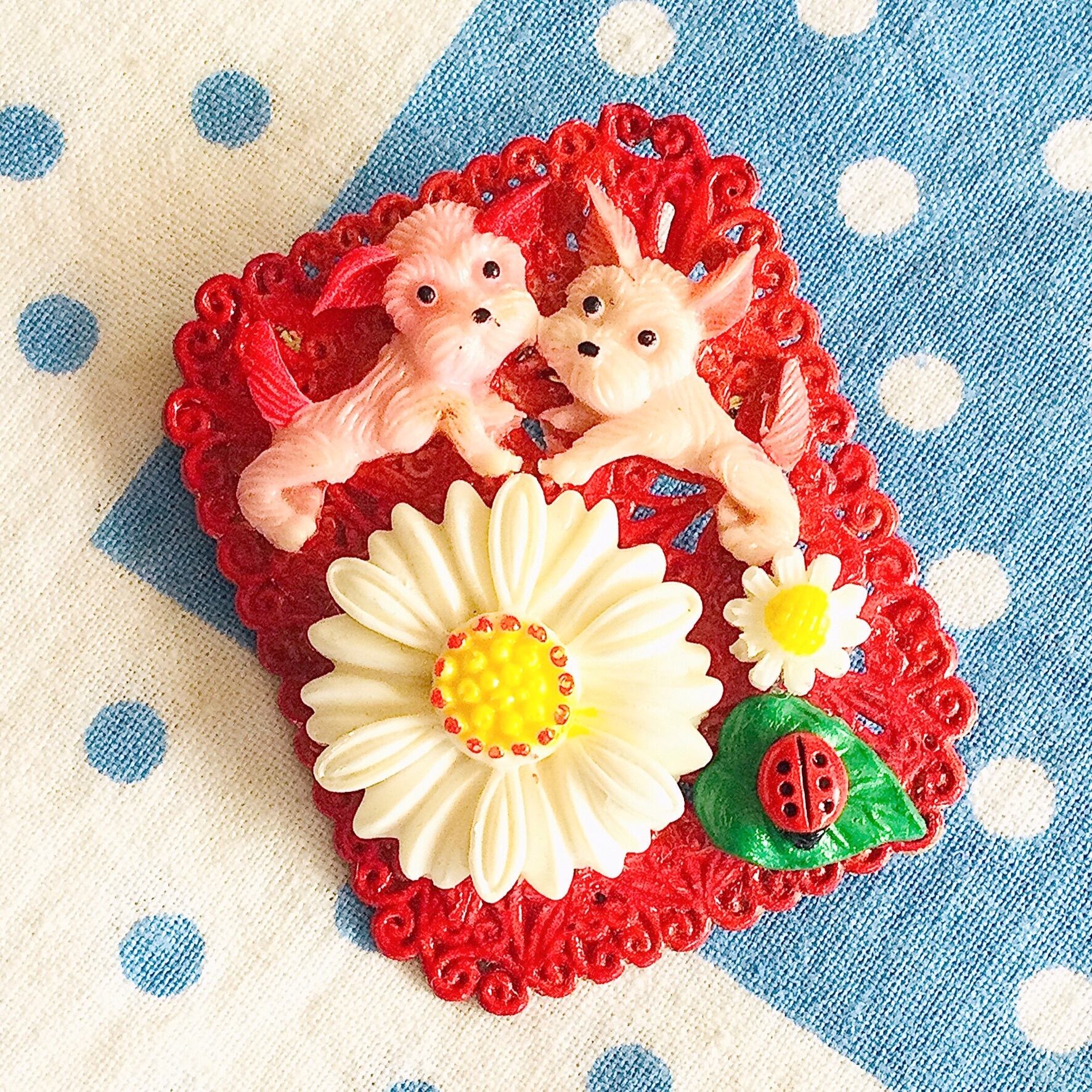 メタル赤土台/セルロイド犬パーツ/プラスチック葉っぱパーツ/