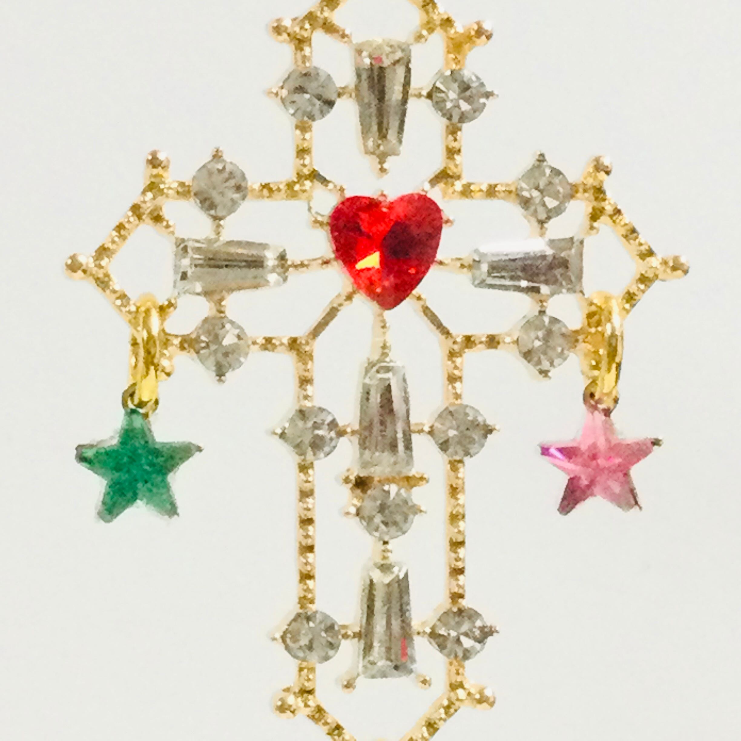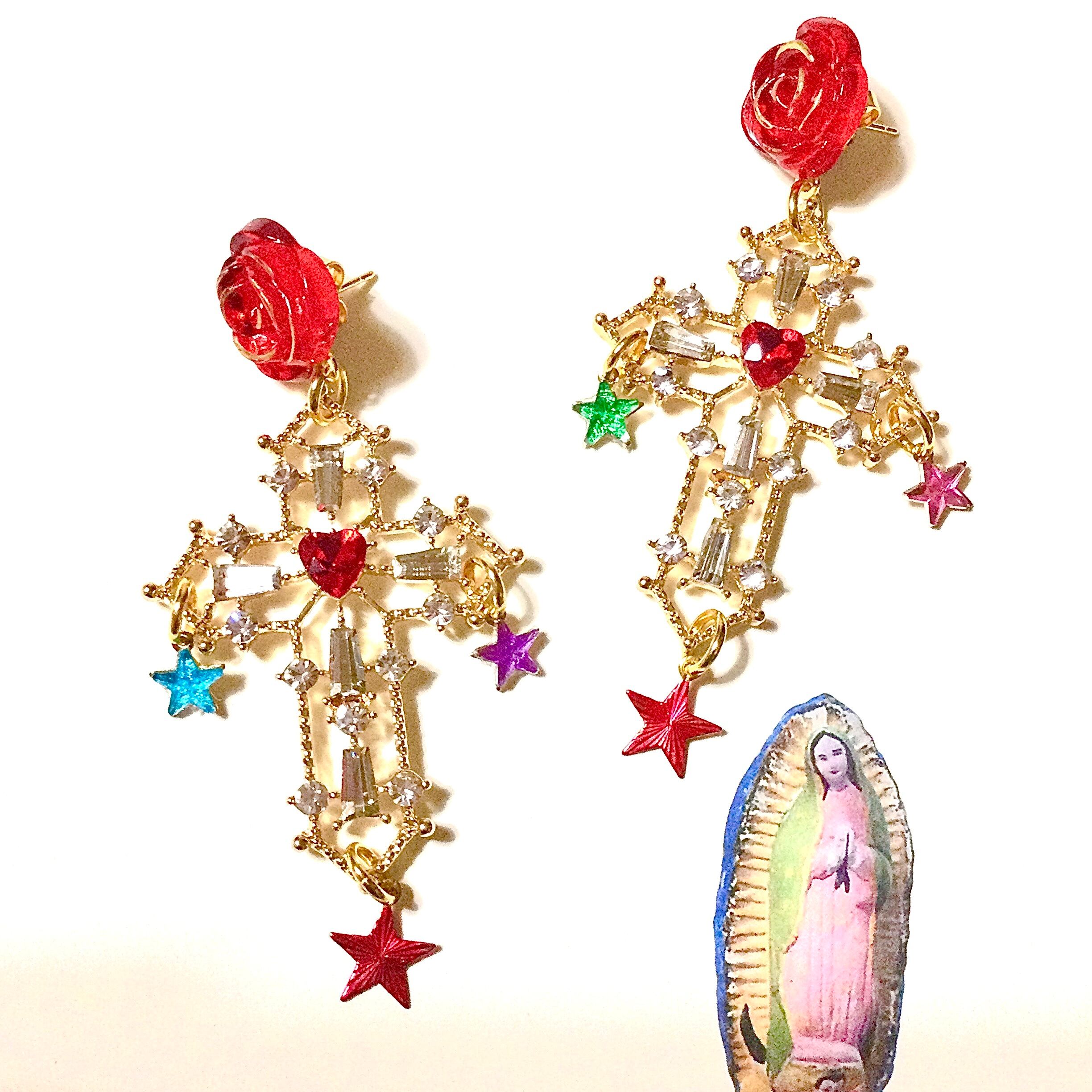 ゴールドのラインが入った赤い薔薇に、星をいっぱい付けた十字架のピアス。