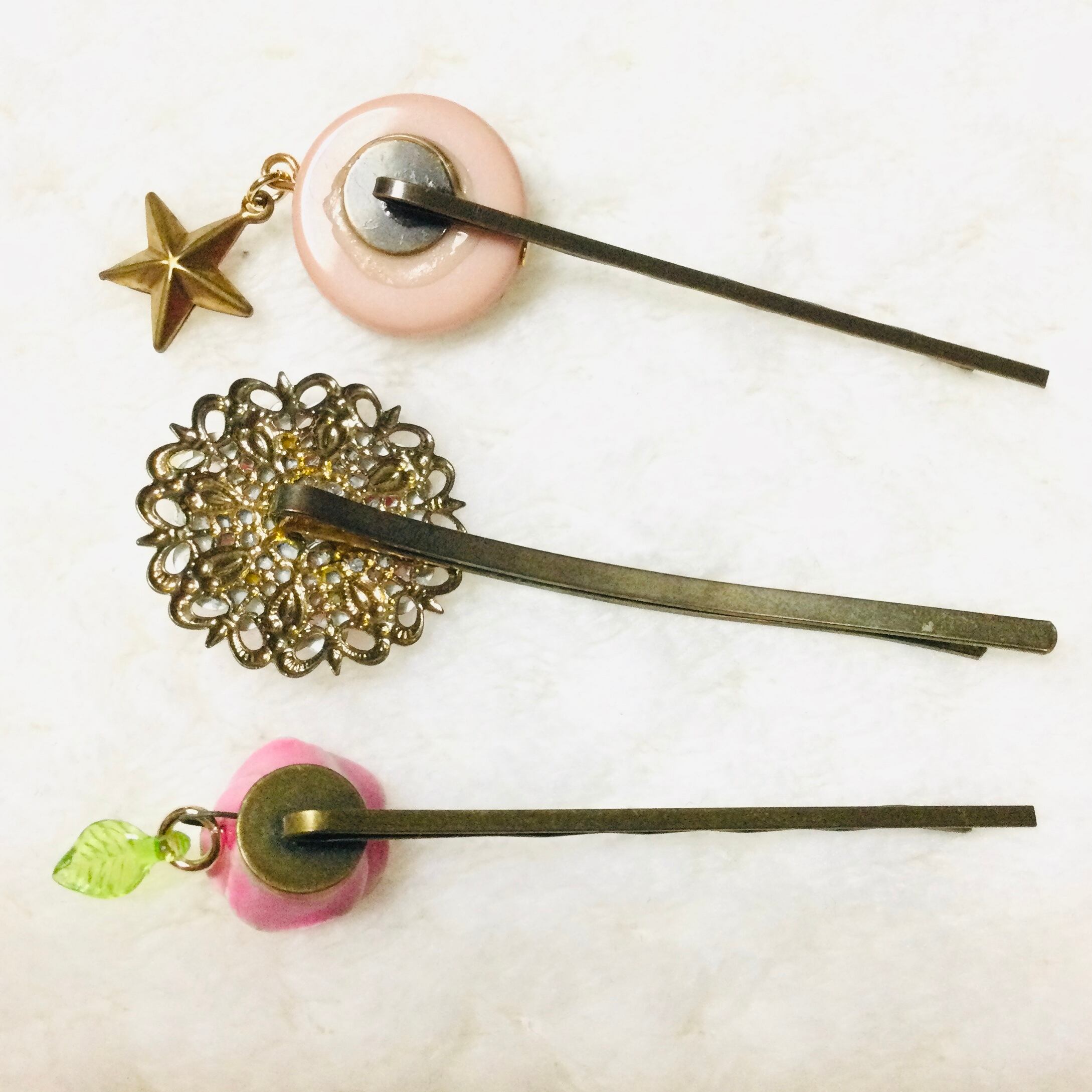 ヘアピンの先に付いたモチーフがユラユラと揺れるのってカワイイですよね。。。♪