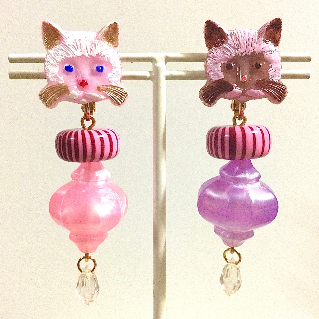 シマシマのオシャレな首輪を付けたネコさんのイヤリング。