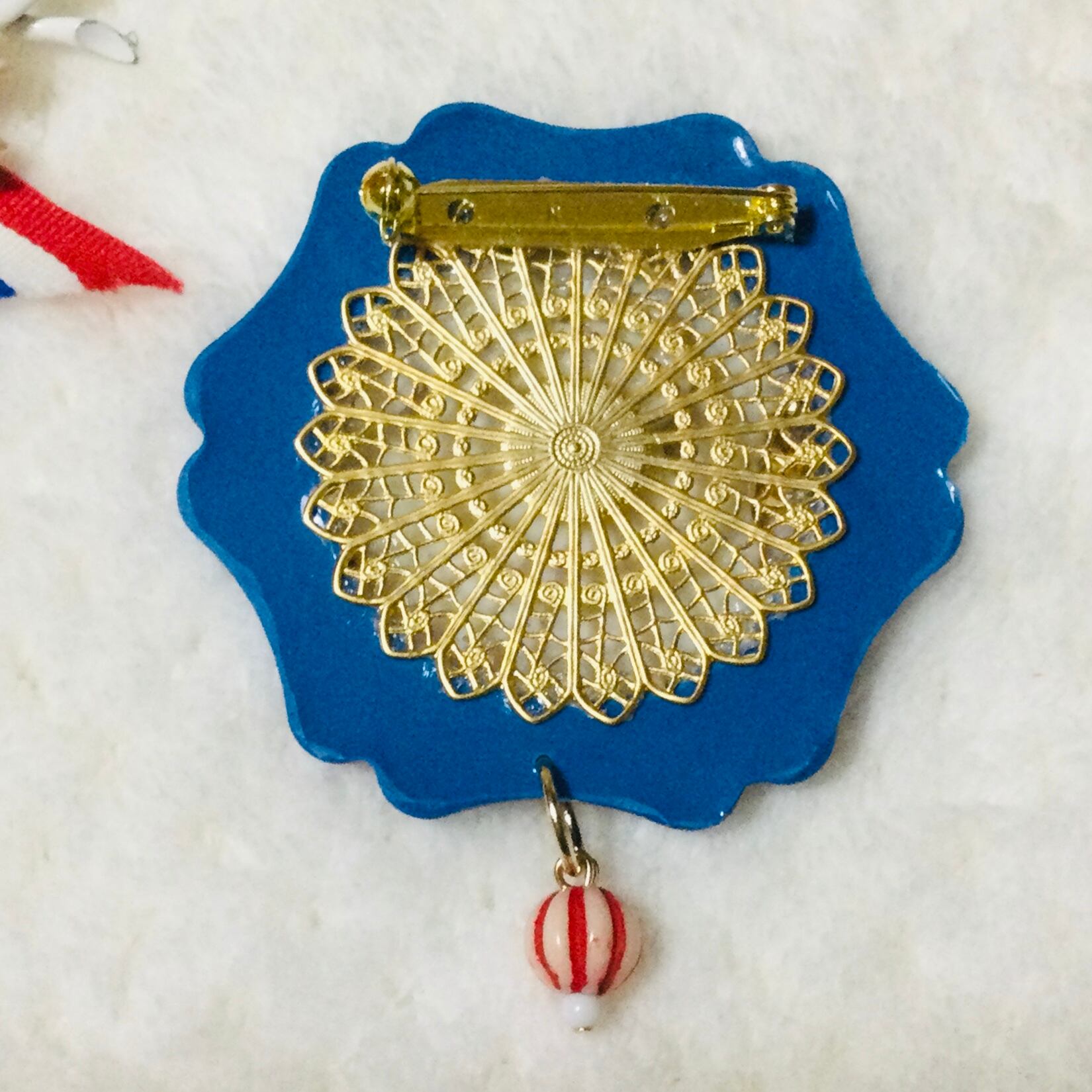 赤白青を基調としたトリコロールカラーのブローチ。