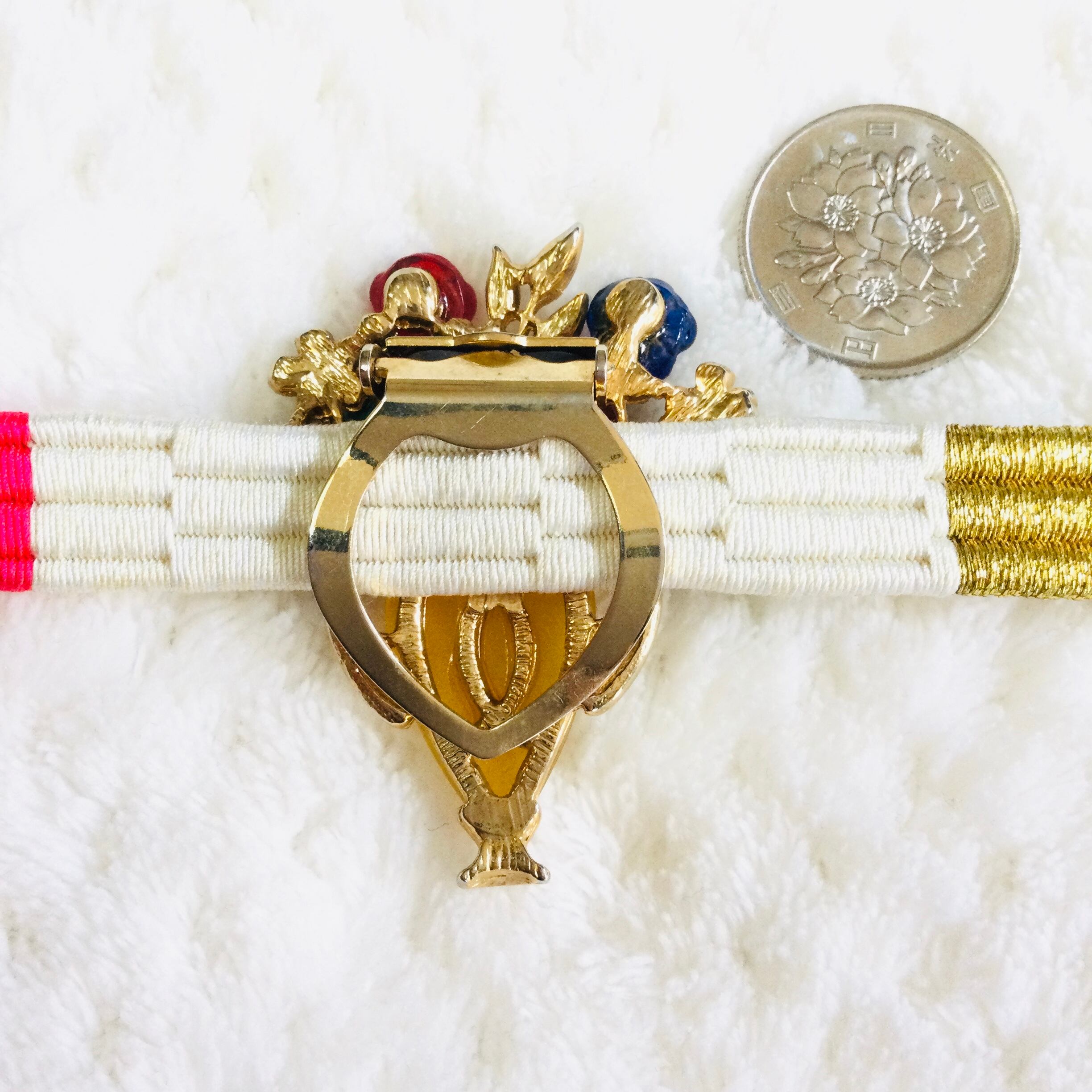 ラインストーンのキラキラとレトロなガラスが高級感のある大好きな帯飾りです。