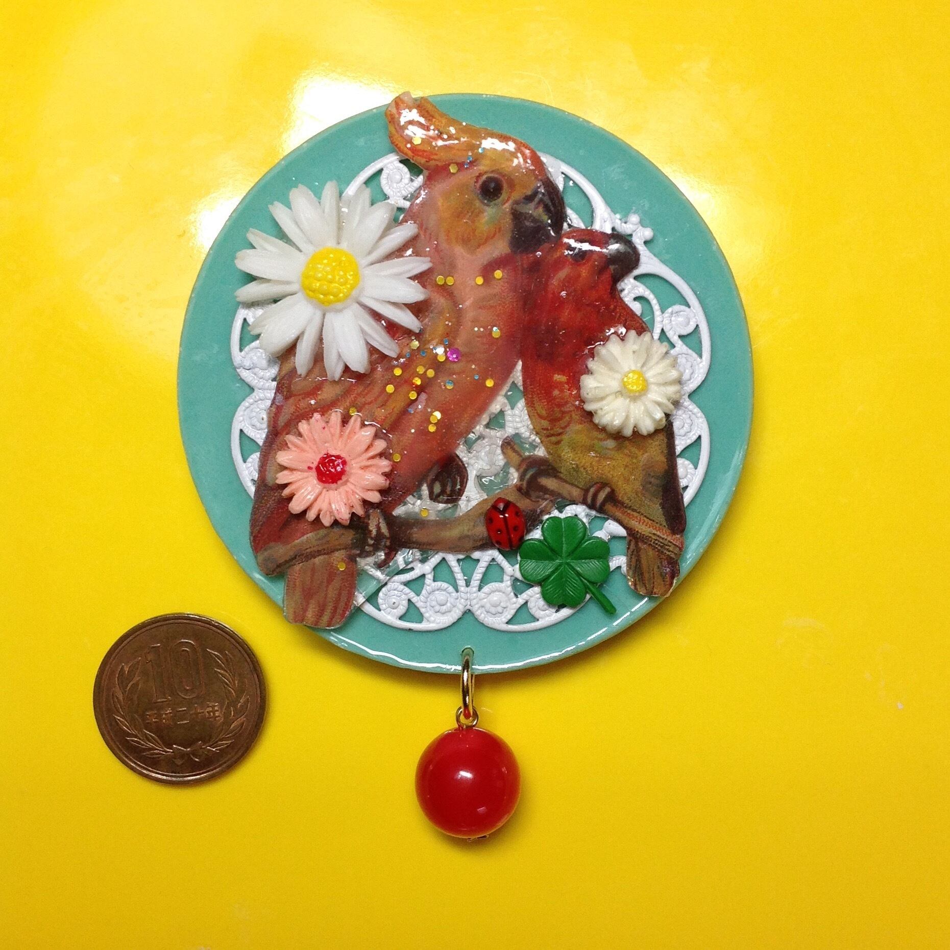 大きいので、お着物の帯につけても。コーディネートのストーリーの主役になってくれそうなオウムちゃんたち。