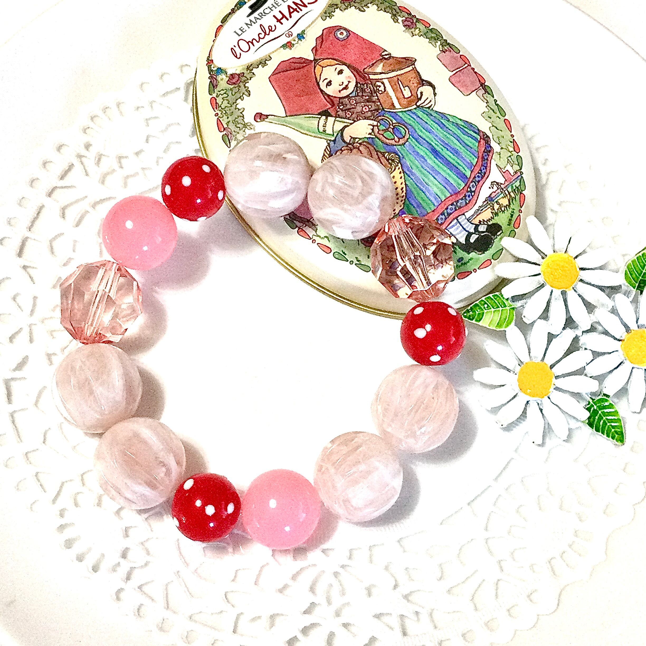 苺ちゃん、と呼びたくなるような赤に水玉ビーズがポイントのゴムブレスレット。