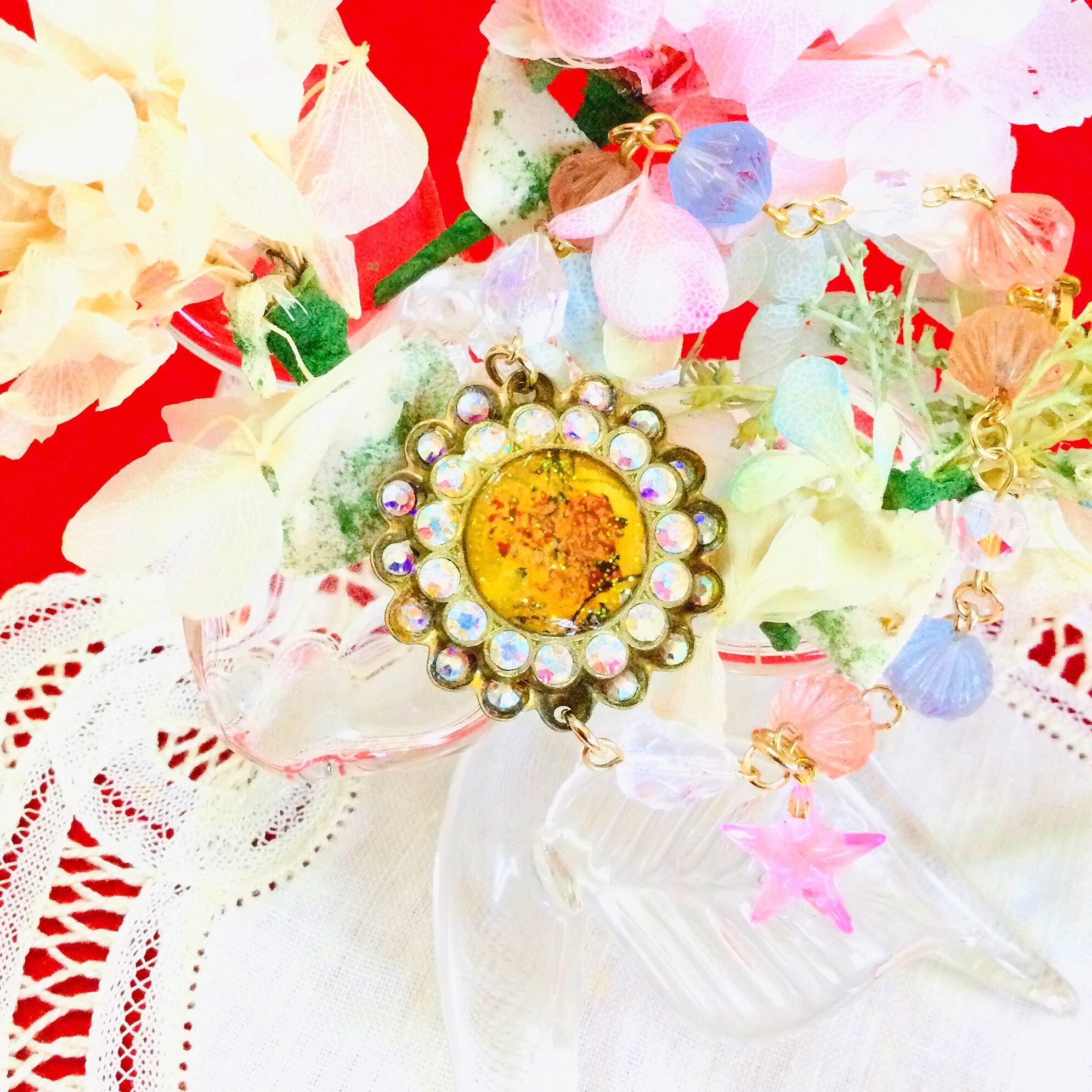 昔の切手を樹脂で閉じ込めたアンティークなムードのパーツを中心に、