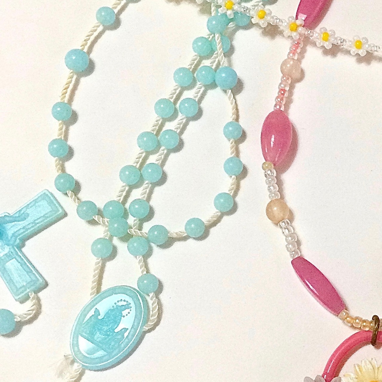なんとも可憐な可愛らしいベイビーブルーのロザリオネックレス。