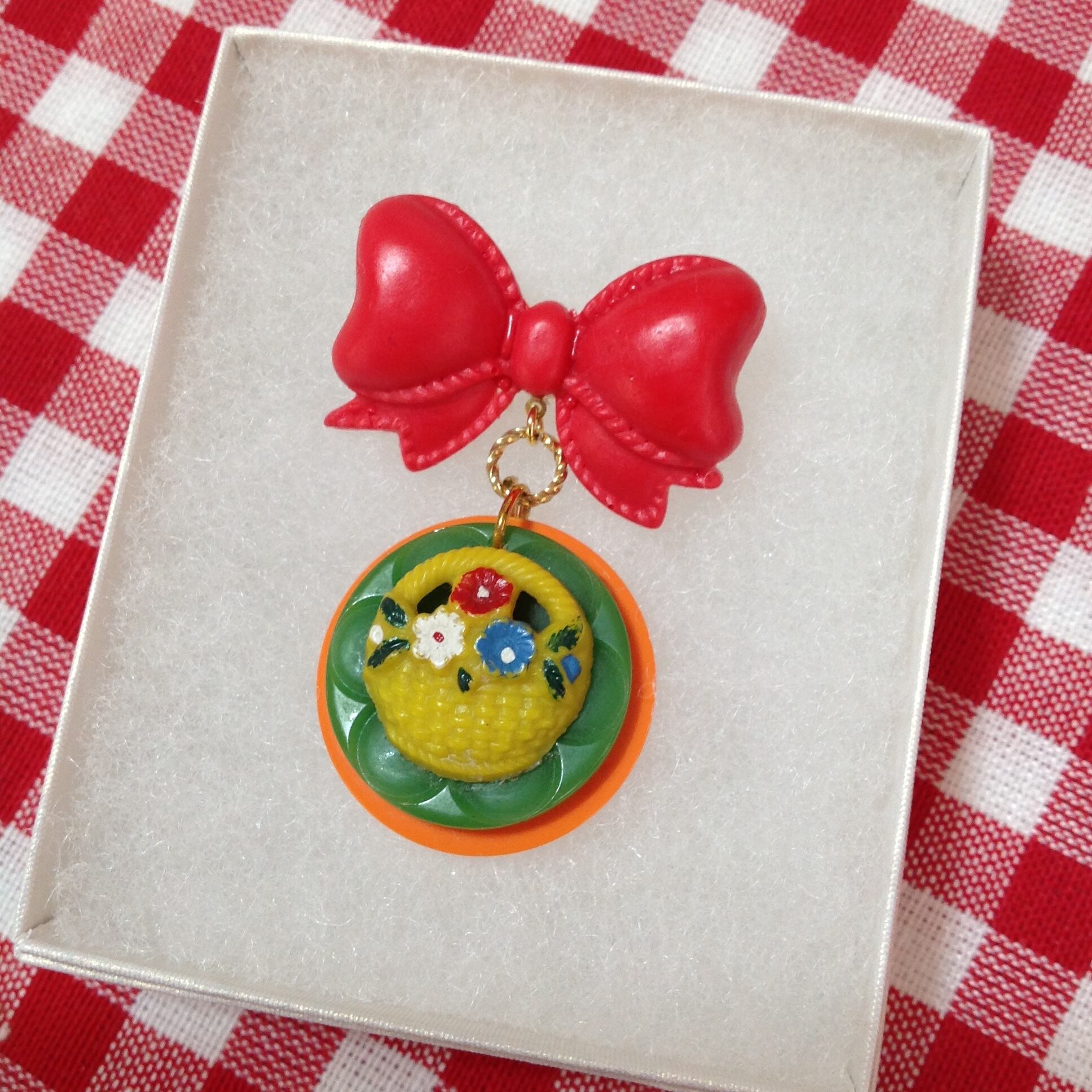 赤いおりぼんと 黄色い花かごの ちいさいめのブローチ❤️
