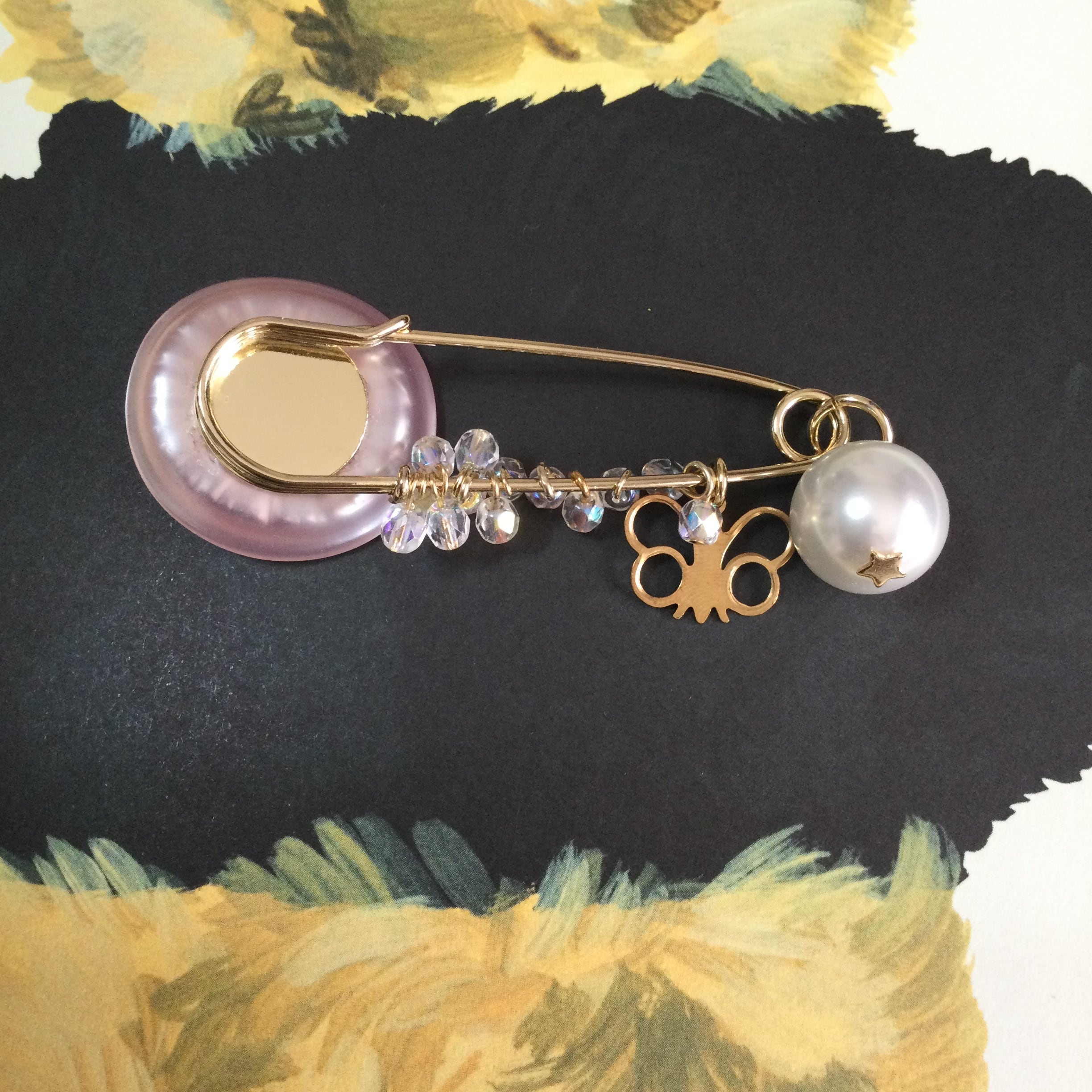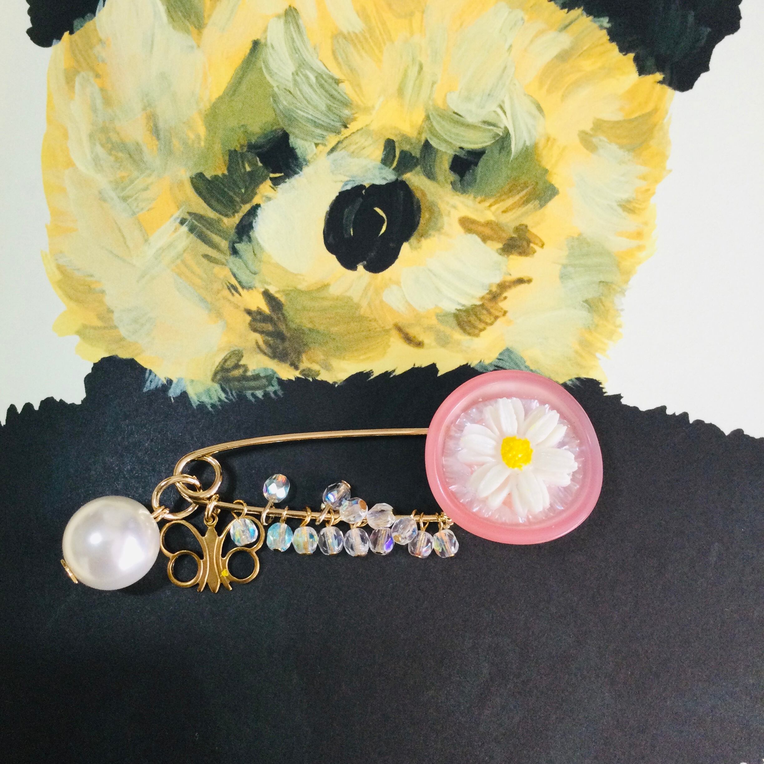 淡く甘いピンク色のボタンにセルロイドのマーガレットが付いたピンブローチ。
