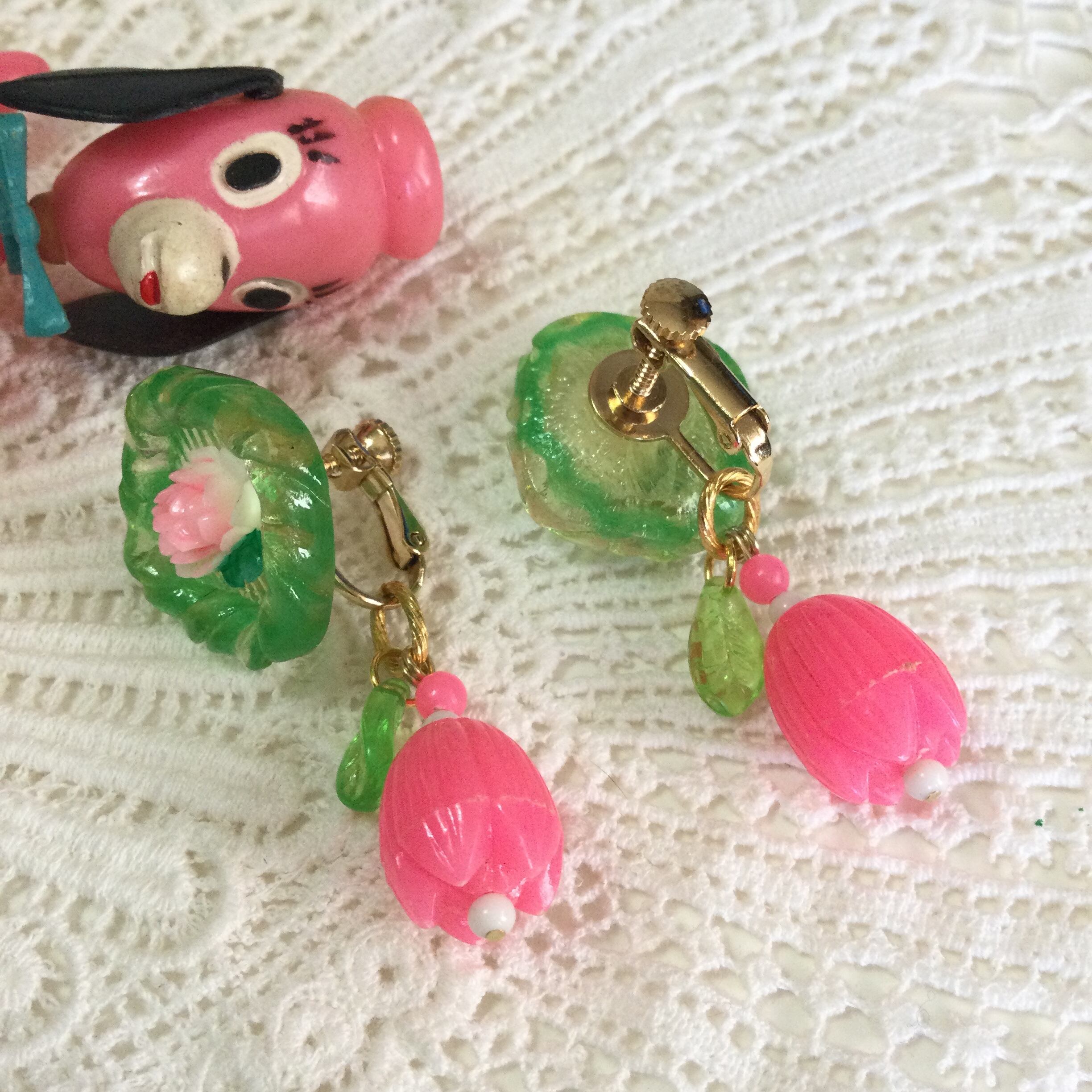 パッと明るいピンクのセルロイドの薔薇が可愛いイヤリング。