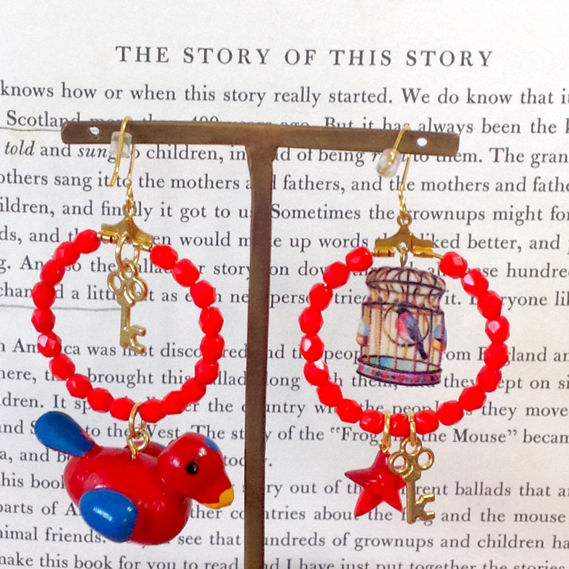 【素材】赤いチェコガラスビーズ/ウッド鳥チャーム/メタル鍵チャーム/鳥かごペーパーコラージュパーツ/赤い星vintageプラスチックetc