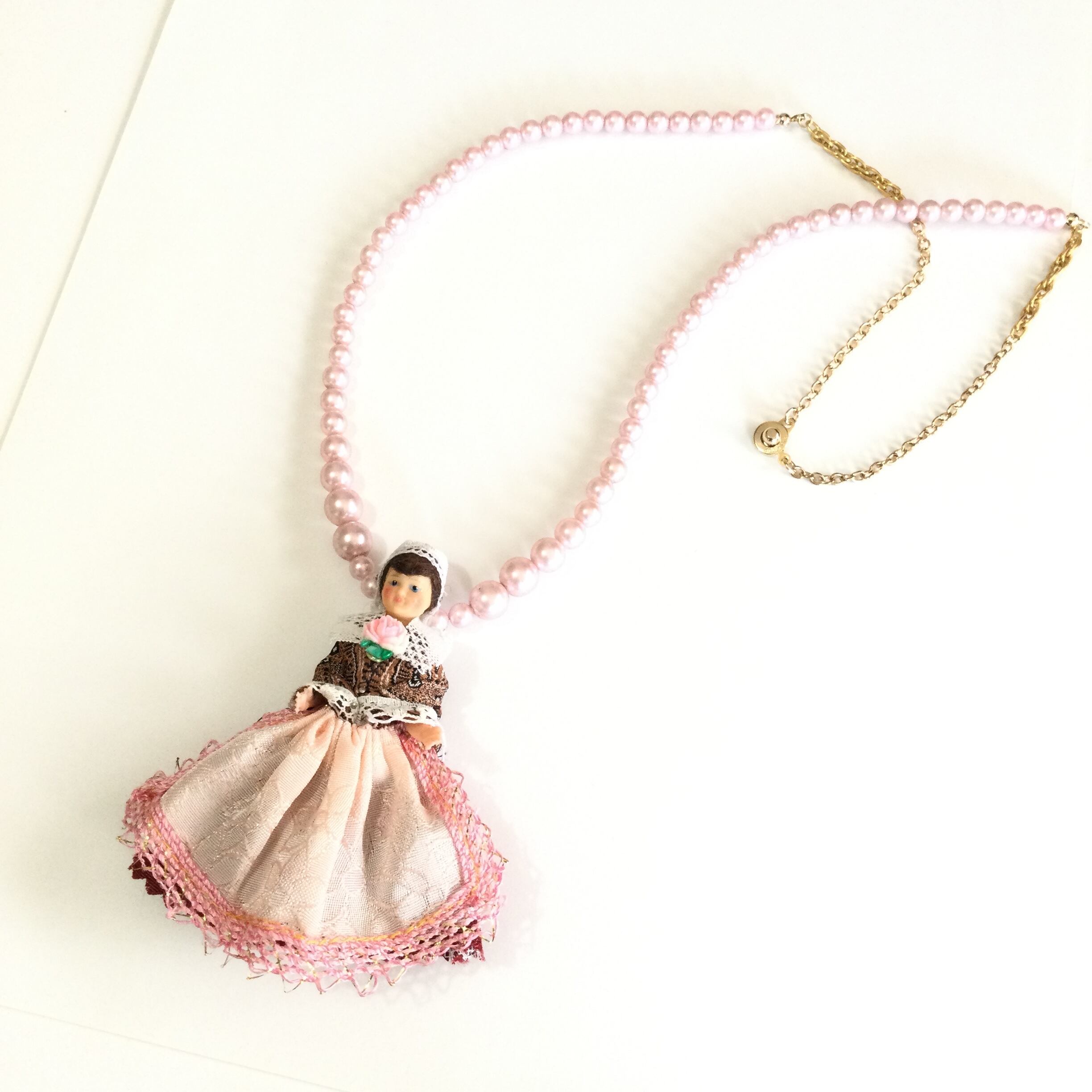 ピンクのエプロン姿がカワイイドールさんのネックレス。ハンドペイントのお顔も好い感じ。