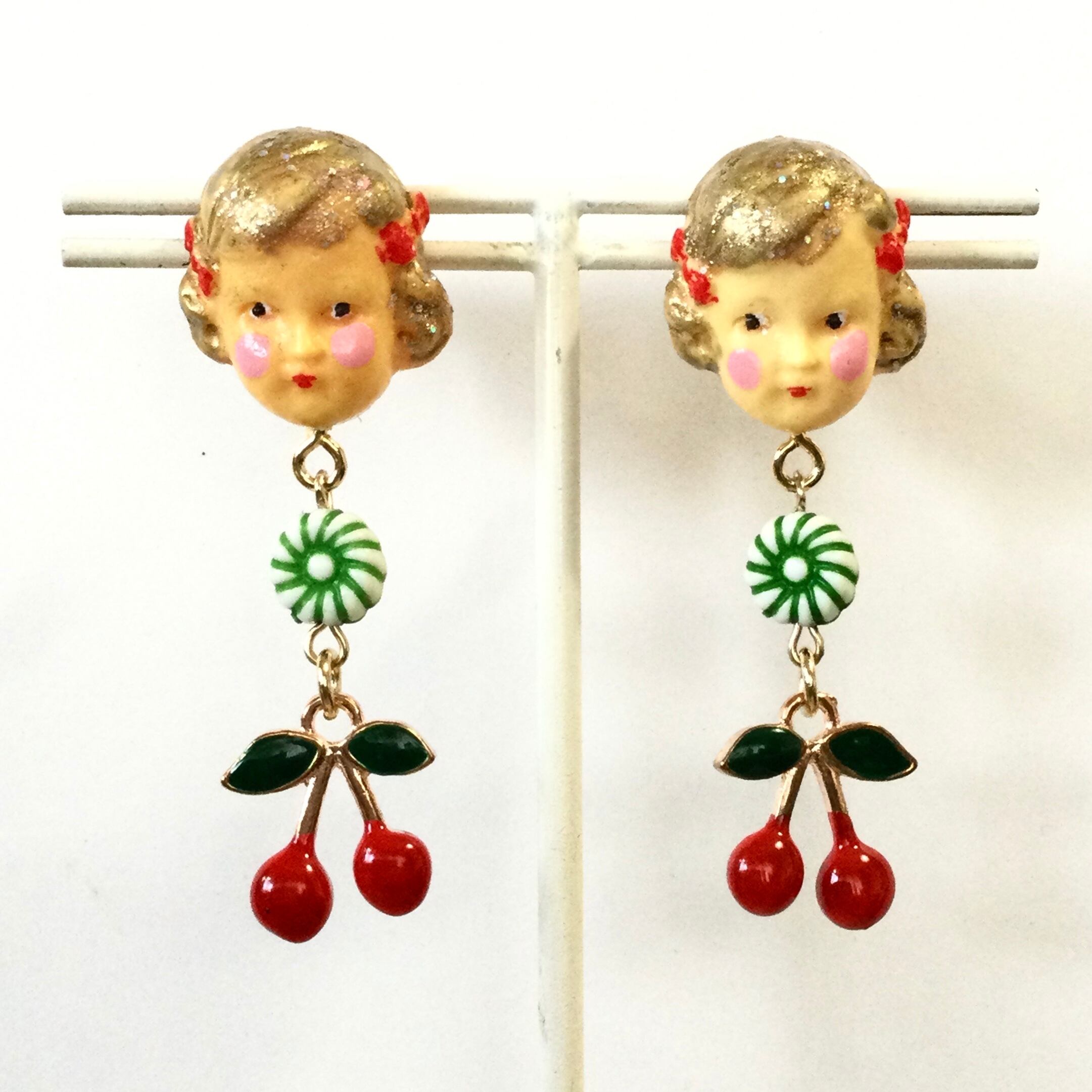 レトロなムードのビーズとさくらんぼも付いて不思議とまとまったデザインのお耳飾りです♪