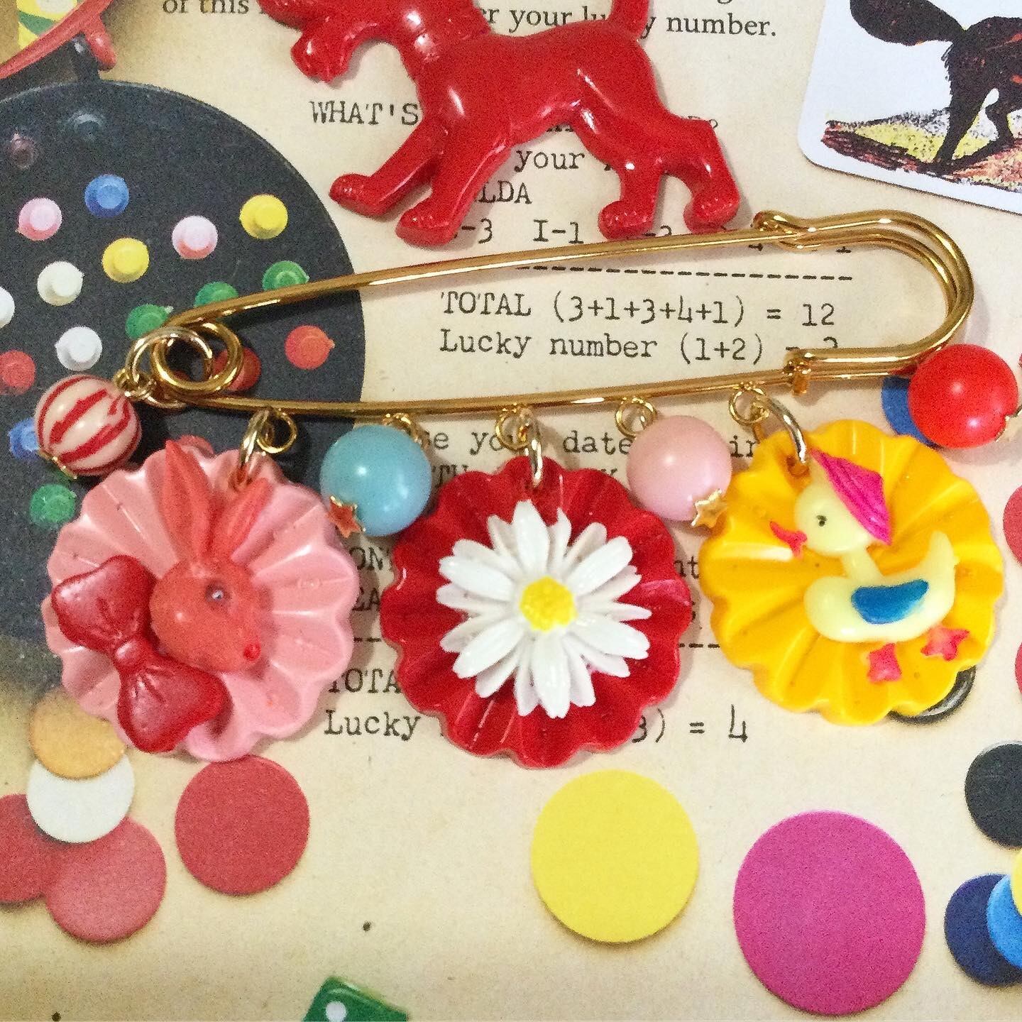 ウサギとマーガレットとヒヨコのピンブローチ。