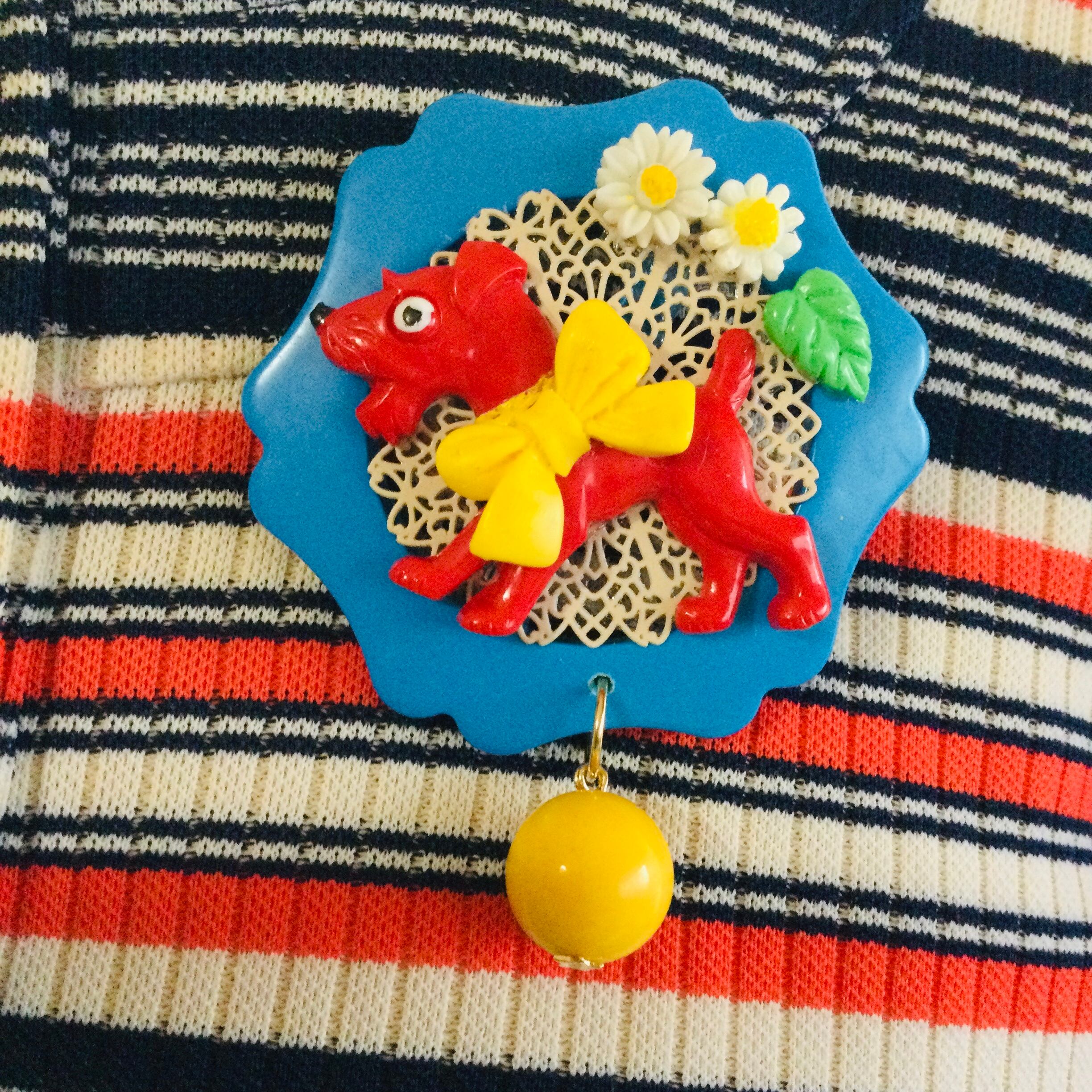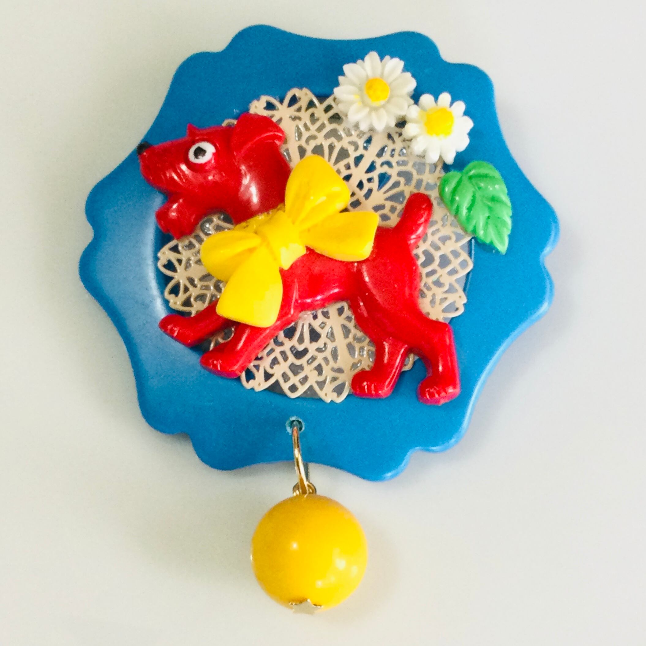 黄色いりぼんの赤い犬 ブローチ(帯飾り)
