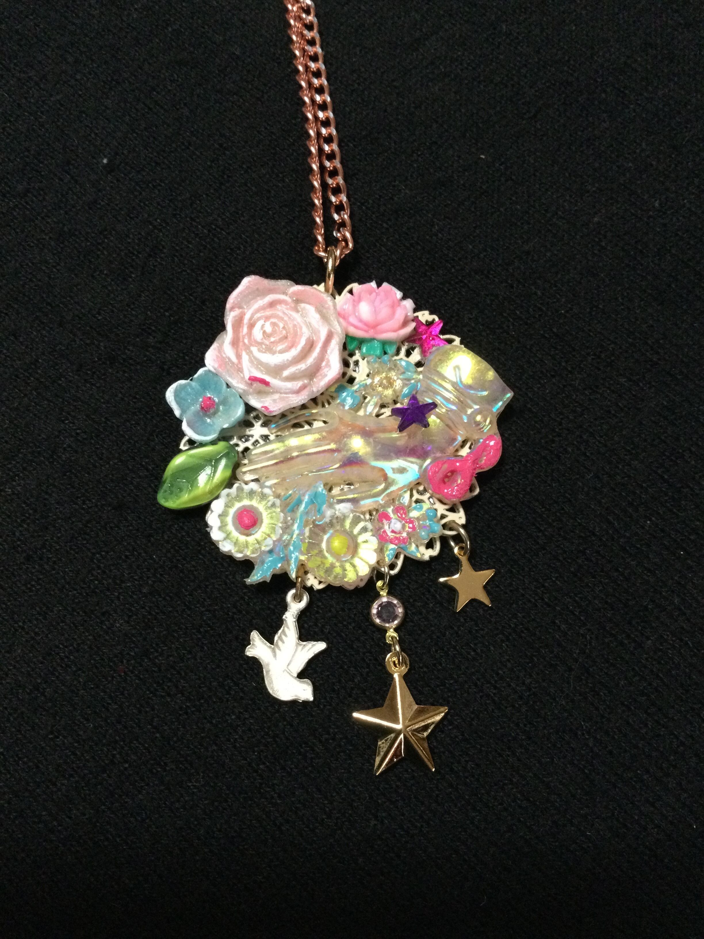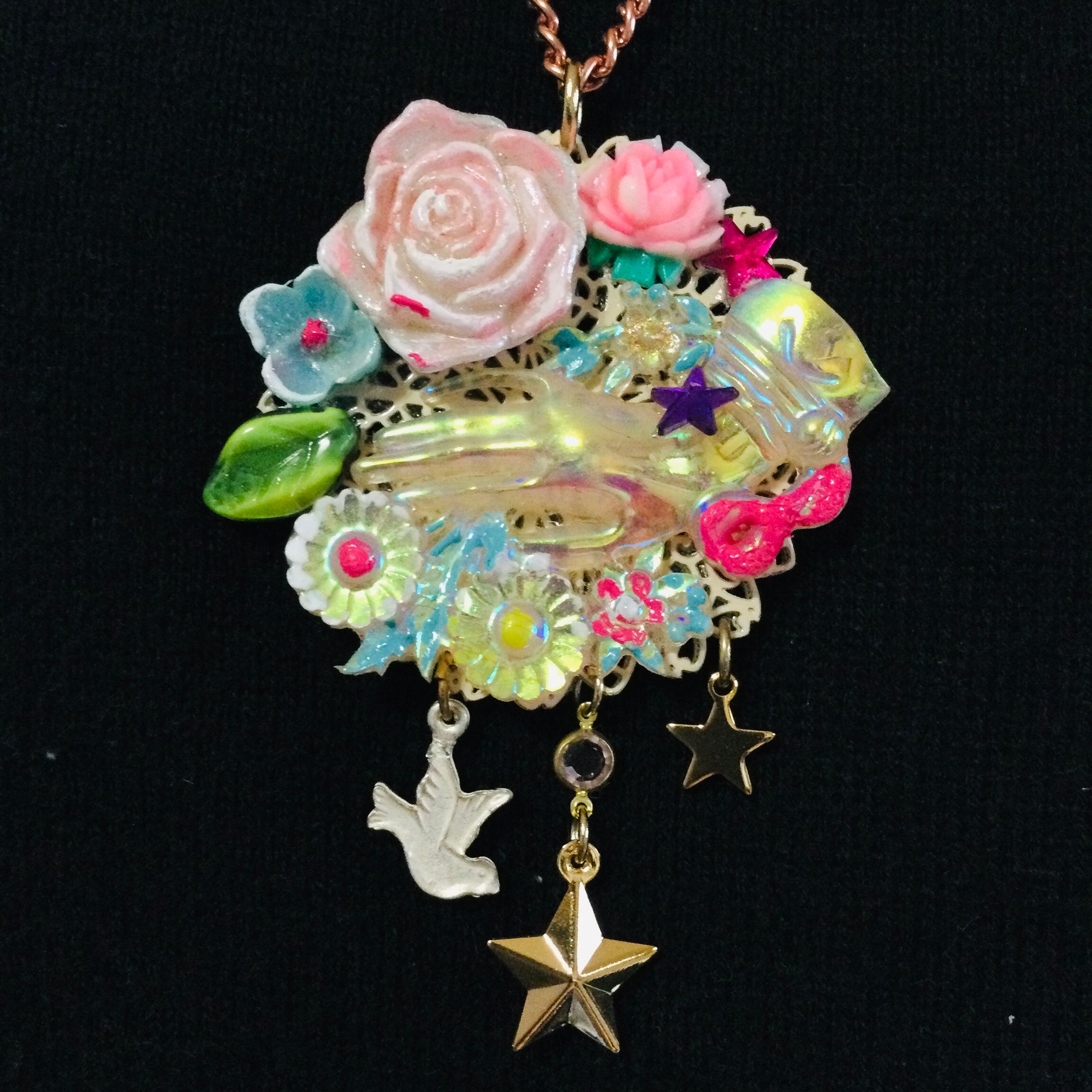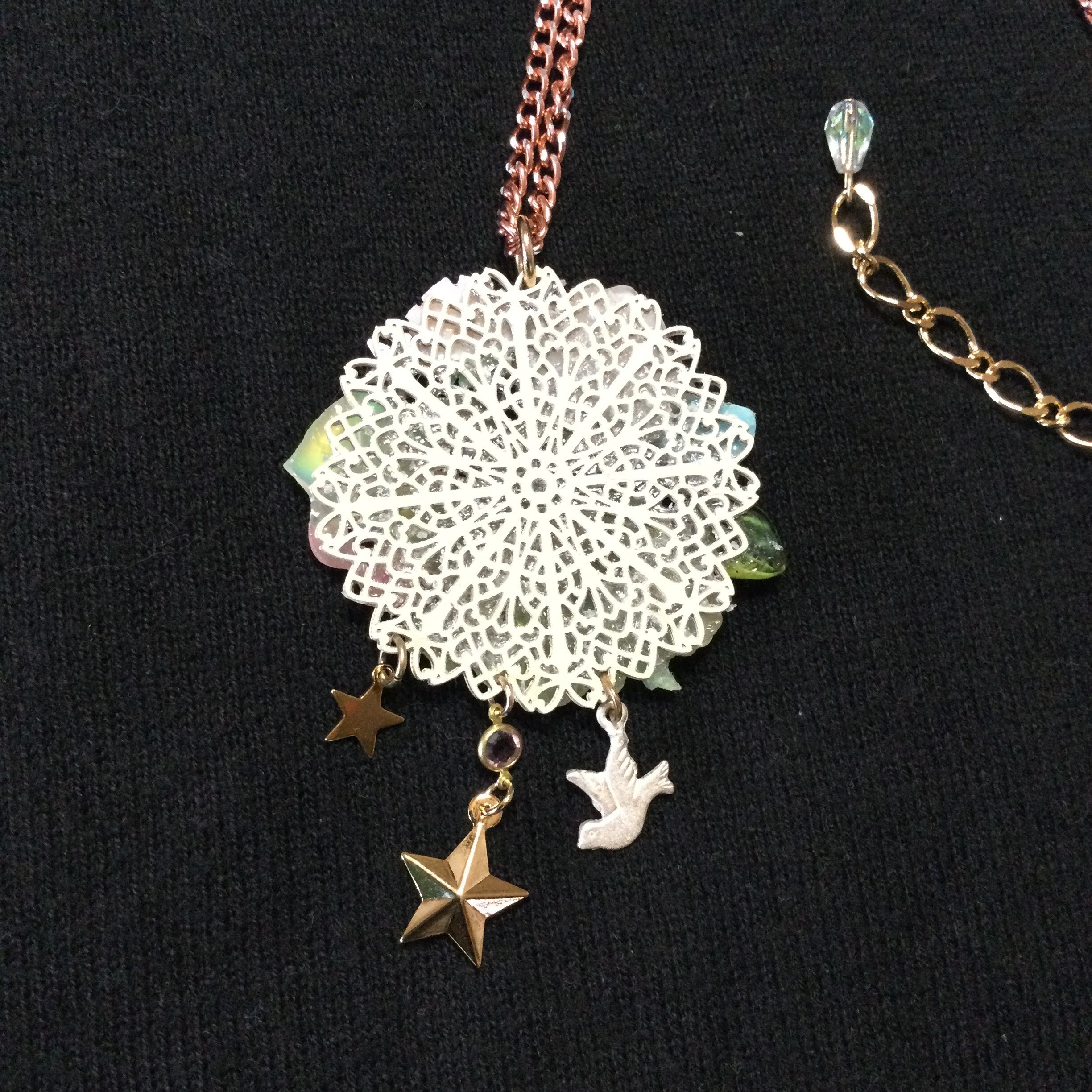 白いハトと大小の星のチャームがシャラシャラ揺れるタイプのペンダント。