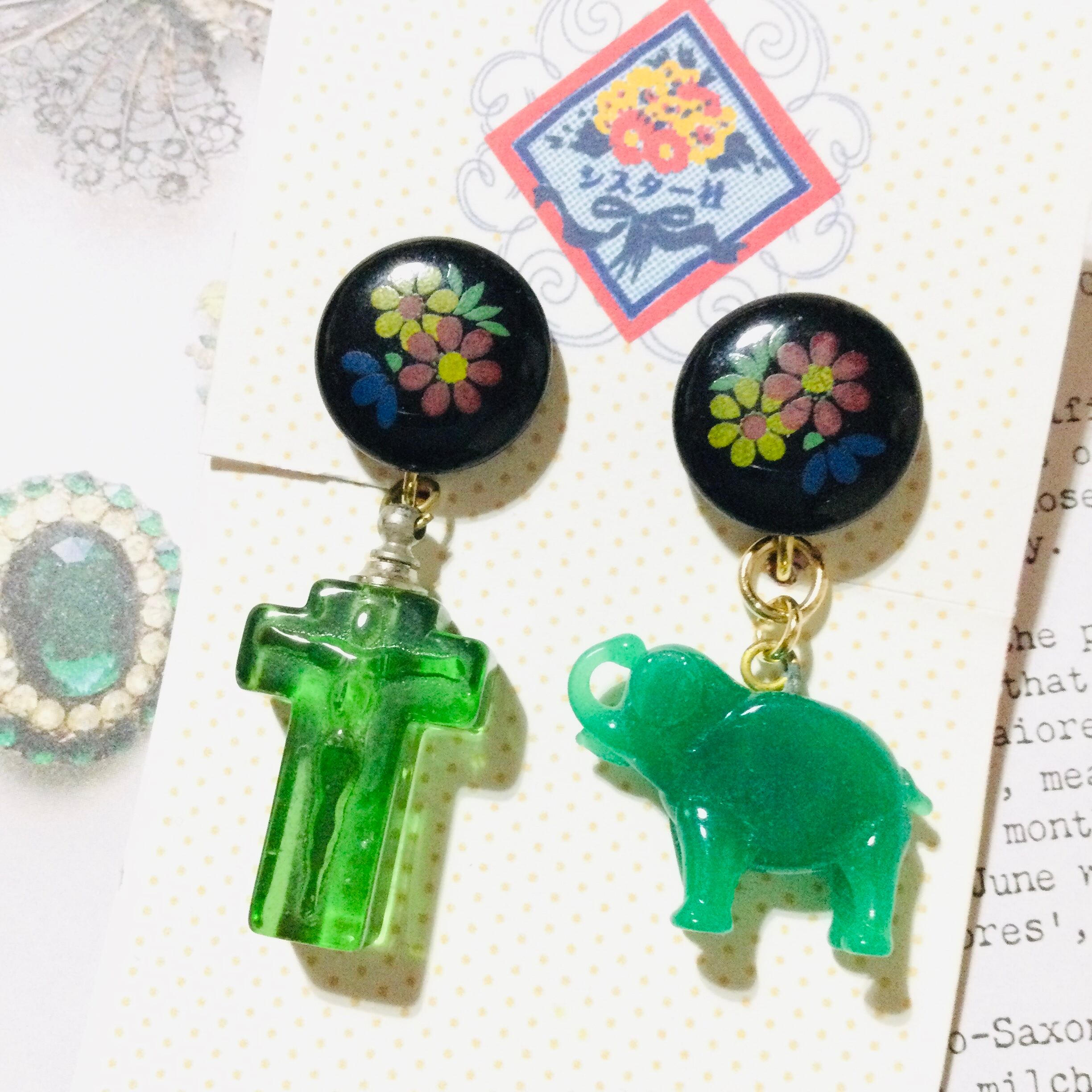 ミドリの象 と 十字架 イヤリング お花付き❤️