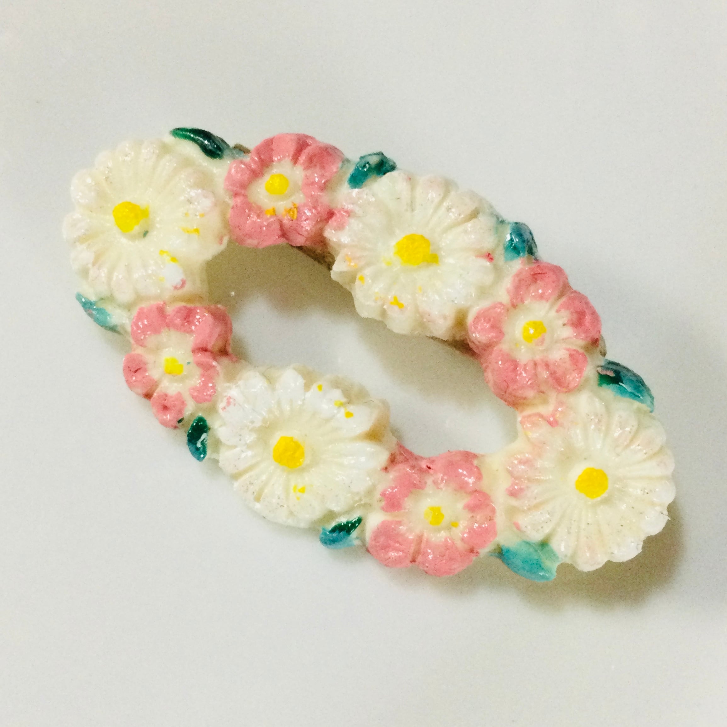 目を引くお花のリース プチブローチ(帯飾り)。可愛らしいマーガレットの花びらが丁寧にハンドペイントされた小さなブローチです。お花の一枚一枚が繊細に表現されており、どんなシチュエーションにも合わせやすく、気軽に取り入れられます。