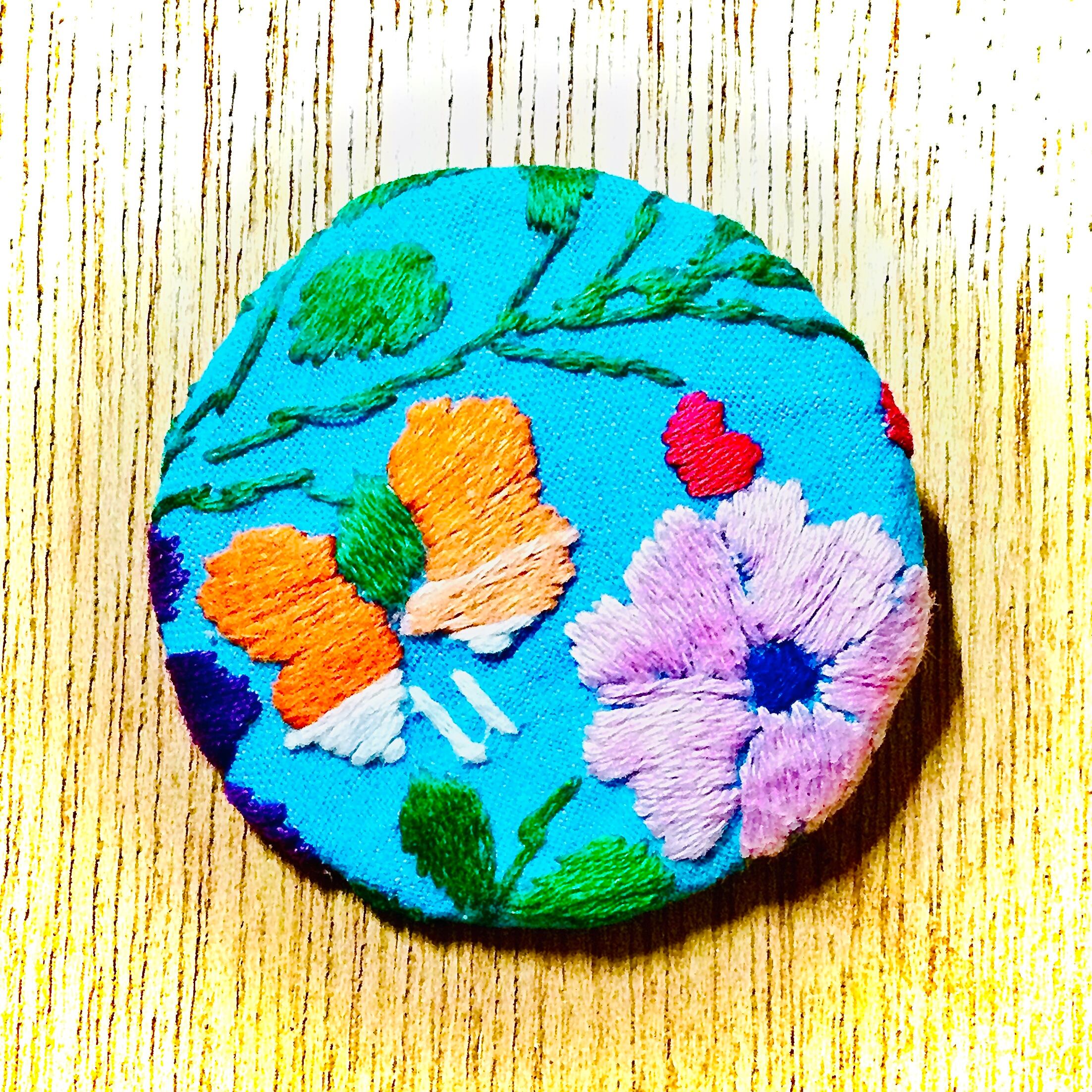 メキシコのちょうちょをモチーフにした、刺繍ブローチ(帯飾り)です。メキシコの伝統的な布を使用した缶バッジで、美しいカラフルな糸で織り込まれたちょうちょのモチーフが特徴的。