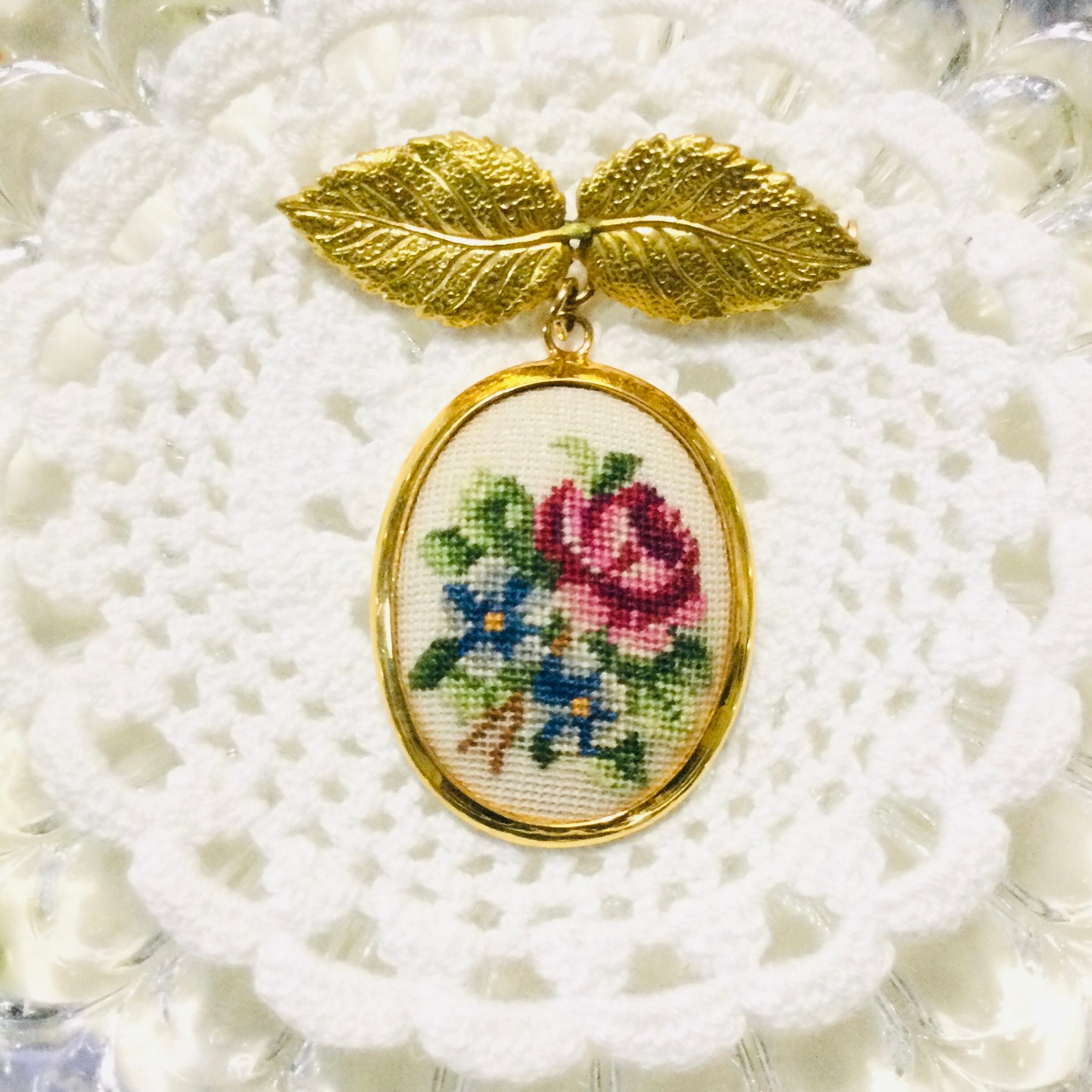 とっても繊細な薔薇の刺繍が可愛いチャームに、葉っぱのブローチ金具を付けたらピッタリでした!