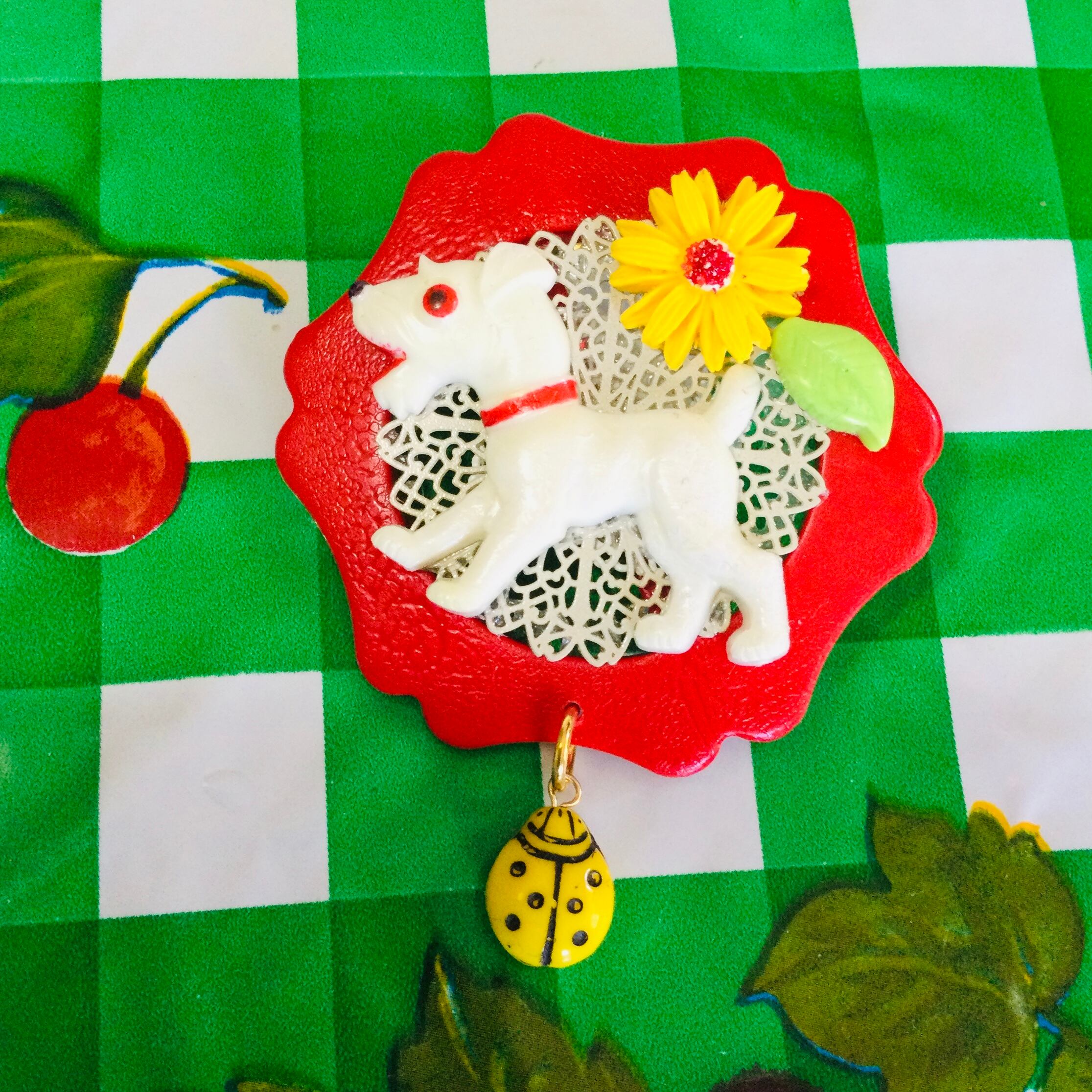 可愛らしいワンちゃんとてんとう虫がモチーフのブローチ(帯飾り)です。白いワンちゃんの表情や、てんとう虫がとても愛らしく、お洋服や帯につけることで一気に華やかさを演出します。手持ちのアイテムにちょっとしたアクセントを加えたい時にもぴったりです。
