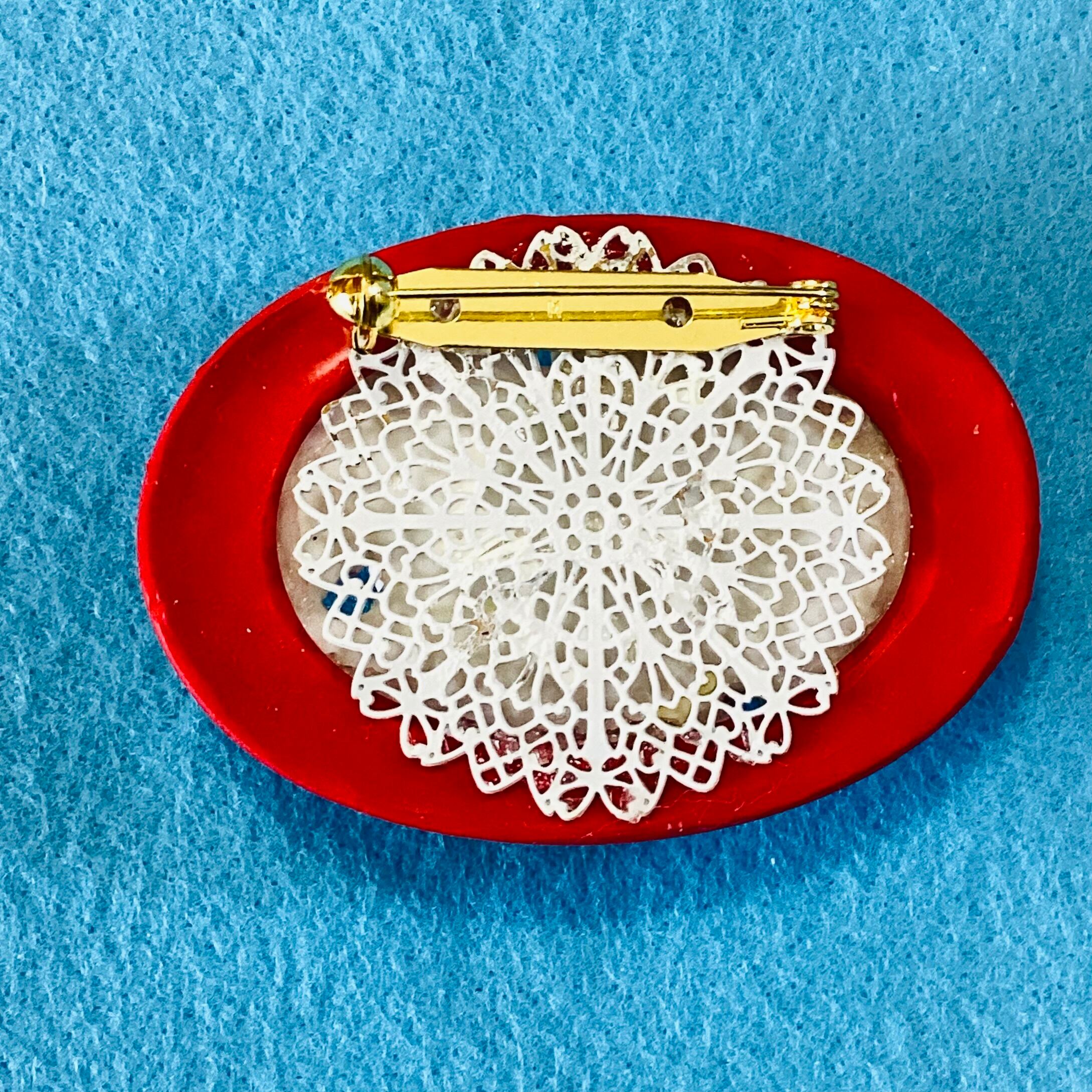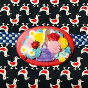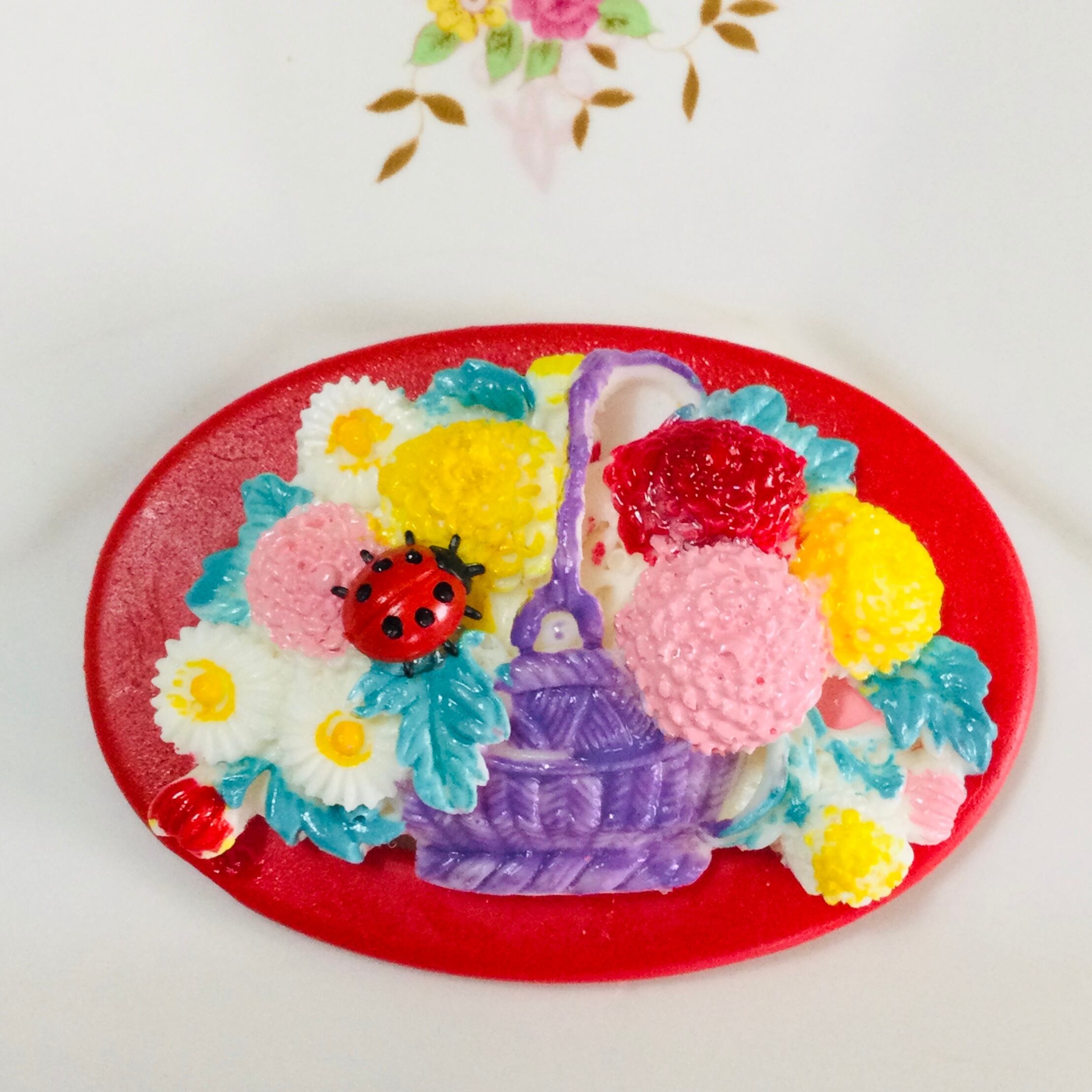 かなり大変な手間と時間をかけて、1色1色の塗料を使いハンドペイントで仕上げたブローチです。花かごのかわいさに加えて、小さなてんとう虫がくっついているところが、とっても可愛いんですよ。